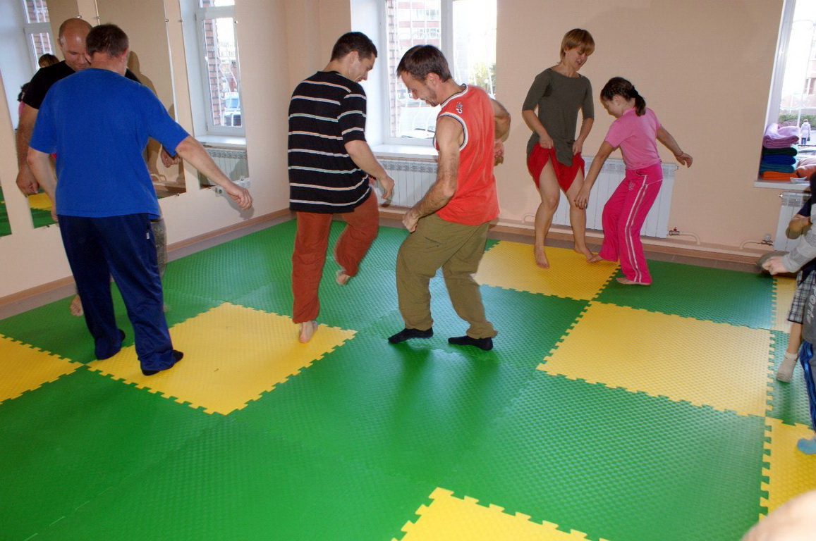 La dernière étape est directement l’installation d’un revêtement modulaire, à sec ou à l’aide de colle. Pour ce faire, les modules - les puzzles doivent être disposés en connectant le «bout» (en utilisant les flèches sur les détails).Le revêtement assemblé doit être légèrement étiré et fixé à l'aide de plinthes, en retrait des murs d'environ 2 cm.Si le revêtement est collé, le socle ne doit être fixé qu'un jour après le collage. Lorsque le tapis n'occupe pas toute la surface du sol, il ne doit pas être fixé.