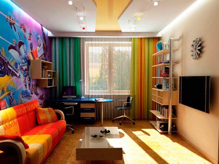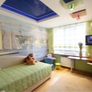 La préférence d'une couleur dépend entièrement de l'enfant lui-même, de son âge et, en principe, des caractéristiques de son caractère. Si le garçon veut vraiment des couleurs vives, vous pouvez aller à sa rencontre et, dans l'aire de jeu, arrangez le plafond de couleur et, dans la zone de loisirs et d'étude, plus détendue.