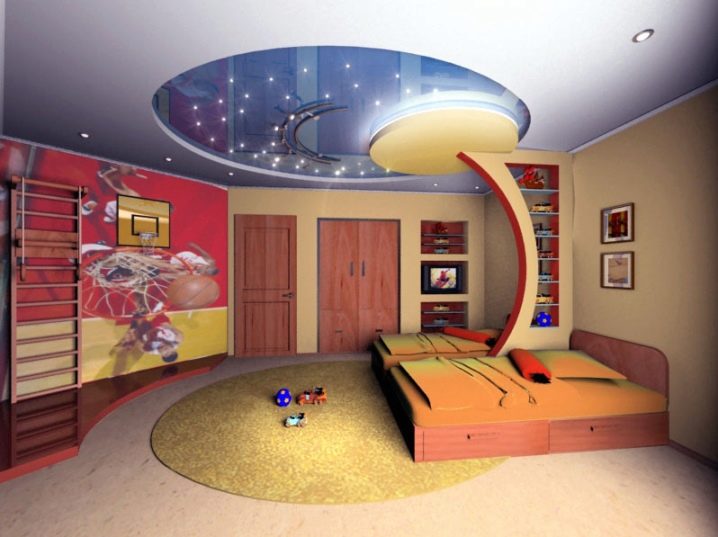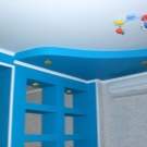Les plafonds à plusieurs niveaux conviennent parfaitement à la chambre des enfants et incarnent les idées les plus audacieuses. Grâce aux éléments suspendus de la salle, vous pouvez créer un ciel étoilé ou une piste de course.Après tout, au plafond, vous pouvez créer une structure similaire à celle de corps célestes, d’étoiles, de tribunes de stades.