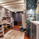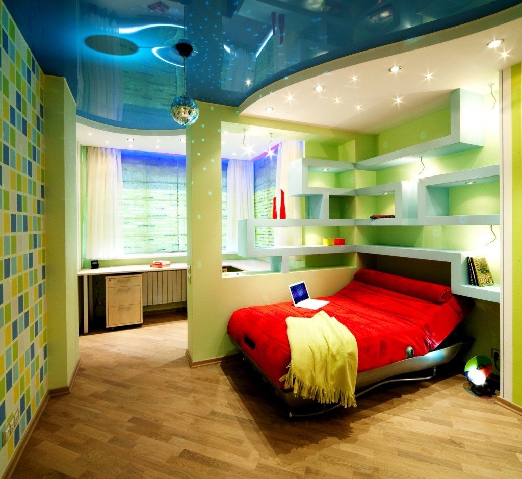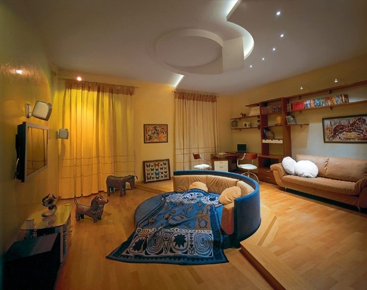 En outre, avec l'aide de plafonds à plusieurs niveaux, vous pouvez zoner une pièce. Ainsi, vous pouvez facilement distinguer la zone d'étude et la zone de jeu de la chambre à coucher. Par exemple, dans l'aire de jeu, le plafond peut être élevé pour augmenter l'espace libre, et dans la chambre à coucher, vous pouvez le recouvrir de petites lampes qui ressemblent à un ciel étoilé.