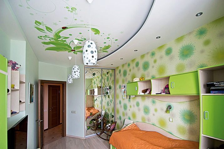 Des versions précédentes, un plafond suspendu se distingue par sa facilité d'installation et son prix abordable. Sa conception est très simple: un cadre en métal est monté sur le plafond principal, sur lequel des modules de plafond spéciaux sont déjà suspendus. L'avantage est que leur matériau de fabrication est varié: bois, plastique, plâtre et même des éléments de miroir. Pour la chambre des enfants, il est préférable d'utiliser des modules en bois et en plâtre à des fins environnementales et de sécurité. La surface du plafond suspendu peut être à la fois mate et brillante, ce qui sera certainement considéré comme le point culminant de la pièce.