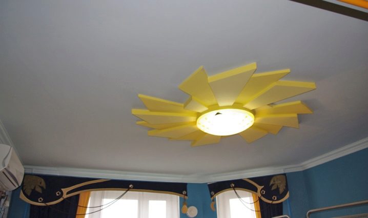 La manière la plus populaire de décorer un plafond dans une chambre pour enfants est de dessiner un ciel. Naturellement, le dispositif d'éclairage servira de soi-disant soleil. Les nuages d'air peuvent être peints à la main ou en plaques de plâtre.