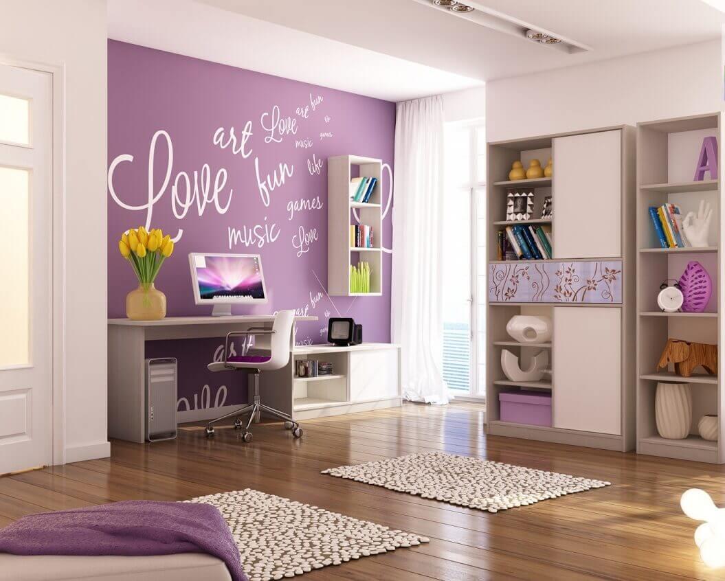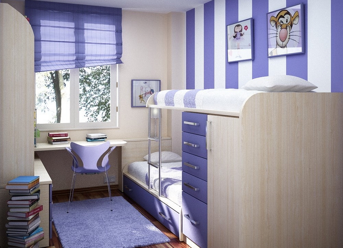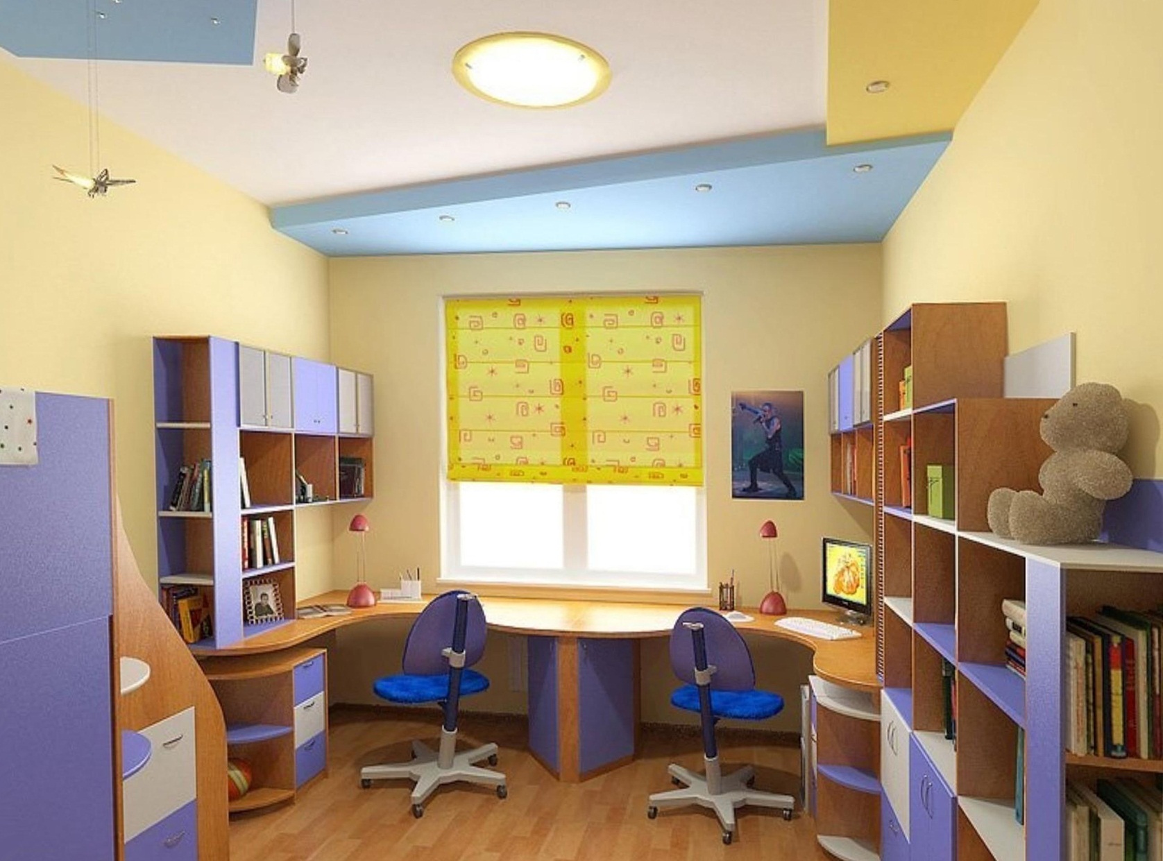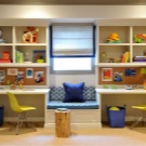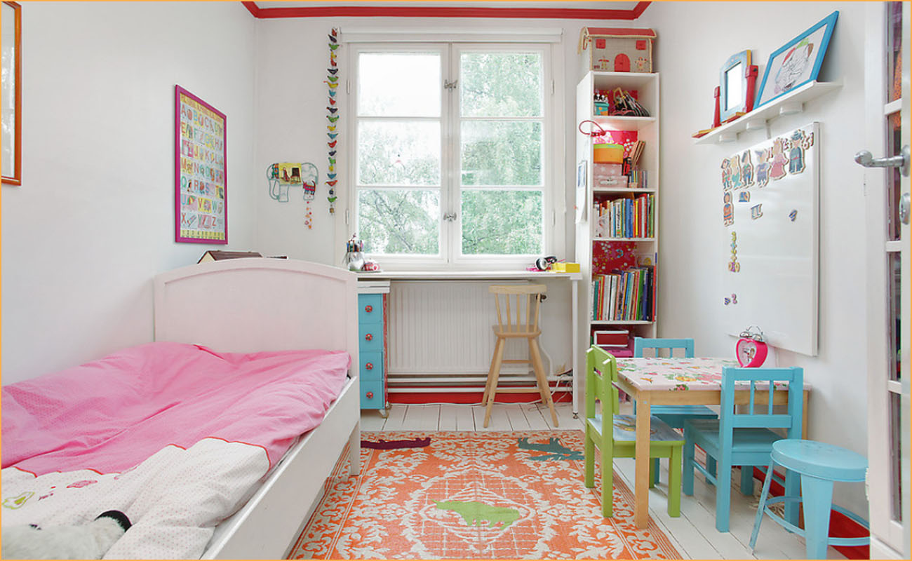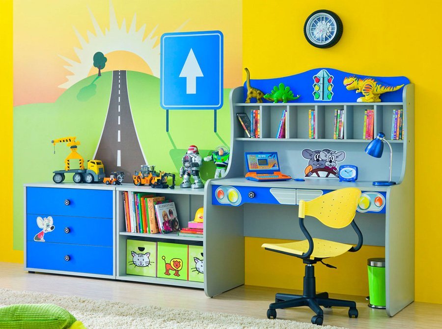 Au-dessus de la table, vous pouvez suspendre des étagères multicolores pour raviver le coin. Même au lieu de cela, vous pouvez laisser le mur vide pour des affiches ou des dessins.