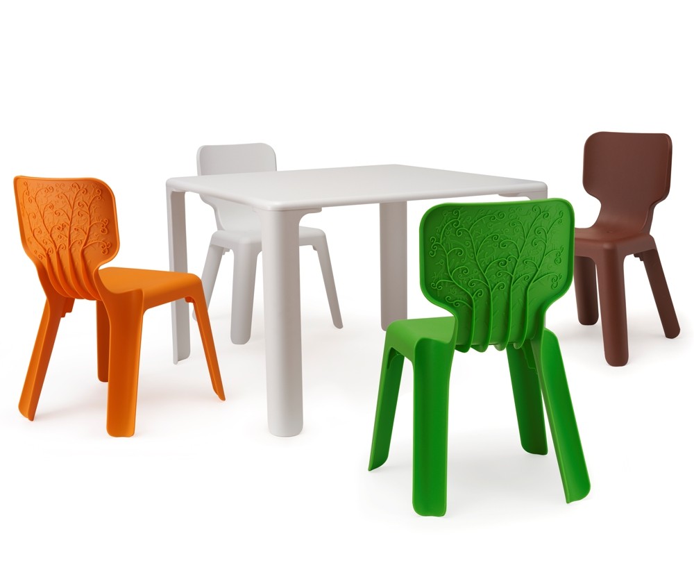 En plastique. Les tables en plastique se distinguent par leur facilité, leur mobilité. L'enfant lui-même peut facilement déplacer la table d'un endroit à l'autre, il sera facile d'effacer les taches, les résidus de colle, les traces de marqueurs. Lumineux et design inhabituel - ces tables attirent toujours les enfants.
