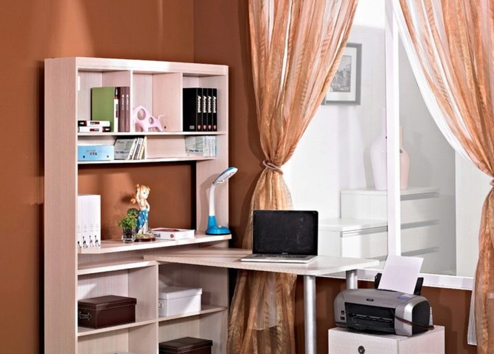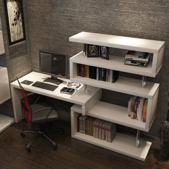 Un bureau d'ordinateur, combiné à des étagères, est une option idéale pour organiser un lieu de travail et d'étude à la maison. Les grandes tables peuvent remplacer une bibliothèque séparée. Des tables avec des étagères de taille plus modeste peuvent être utilisées pour stocker les livres les plus nécessaires et les livres de référence à côté de l'ordinateur.