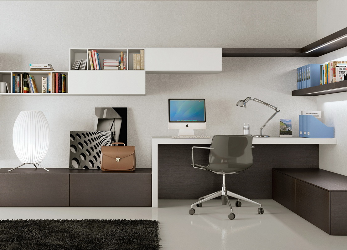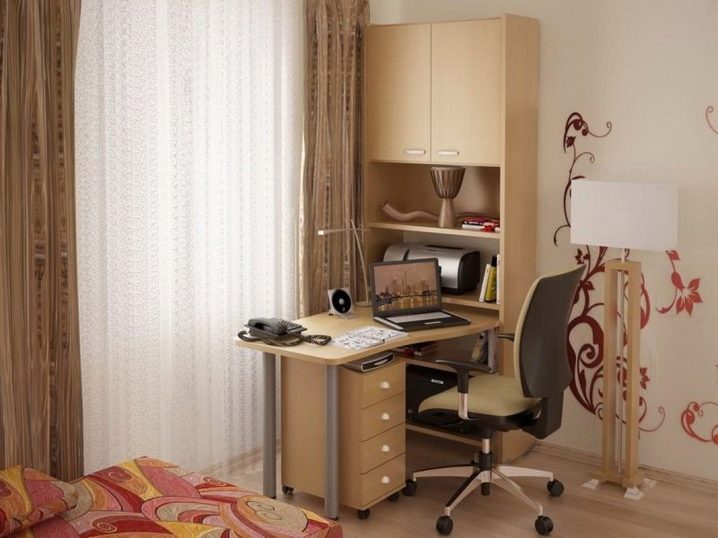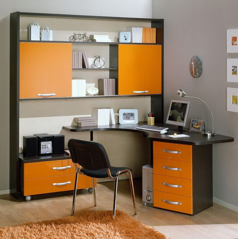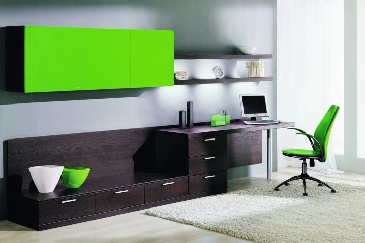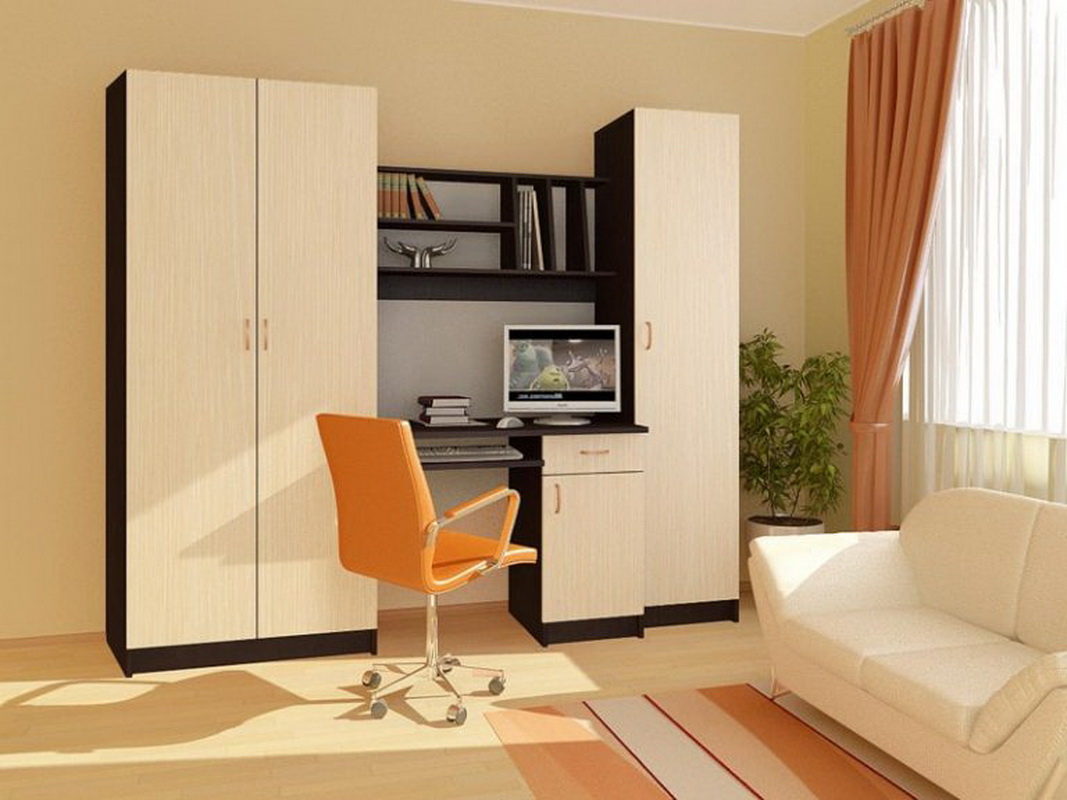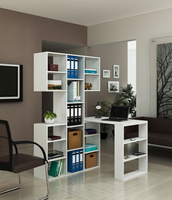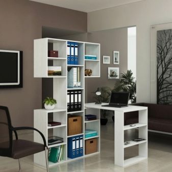 Parfois, les casques modulaires combinent en un élément non seulement un lieu de travail, mais également une armoire. Bien qu’à première vue, une telle division paraisse inhabituelle, elle ne l’est pas tout à fait. Un ensemble de cabinets entoure le bureau d’ordinateur du reste de la pièce, créant ainsi un espace de travail. On pense qu'un zonage clair de la pièce contribue de manière significative au processus de travail ou de détente, car un réflexe conditionné est produit.