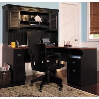 Même dans une petite chambre, il est possible d'installer une table d'angle avec une bibliothèque ou un étui à crayons. Son plan de travail est peut-être plus étroit que celui des géants du bureau, mais il suffit amplement pour assurer un travail confortable.Les grandes tables confortables se trouvent le plus souvent dans des appartements dans des salons lorsque l’on décide d’attribuer plusieurs zones à cette pièce, y compris des espaces de travail, ou dans les bureaux de bureaux et de bureaux privés.