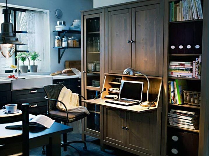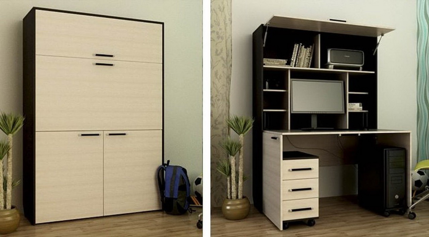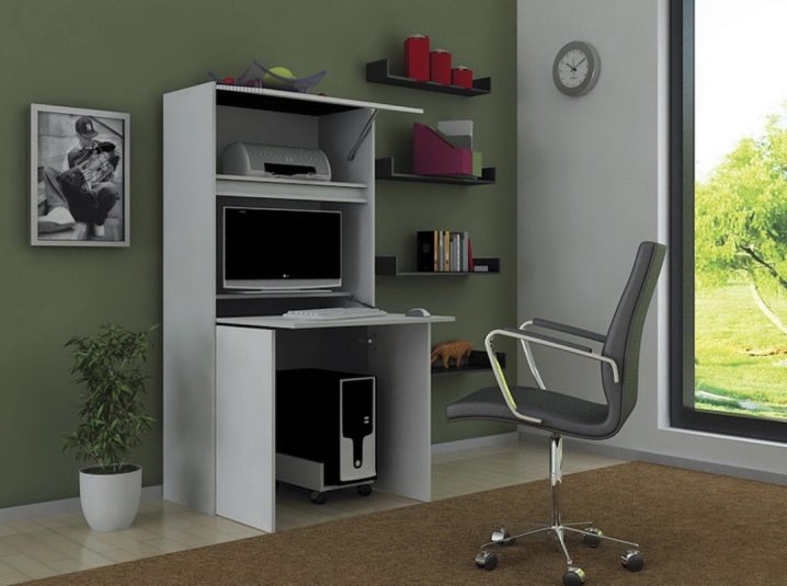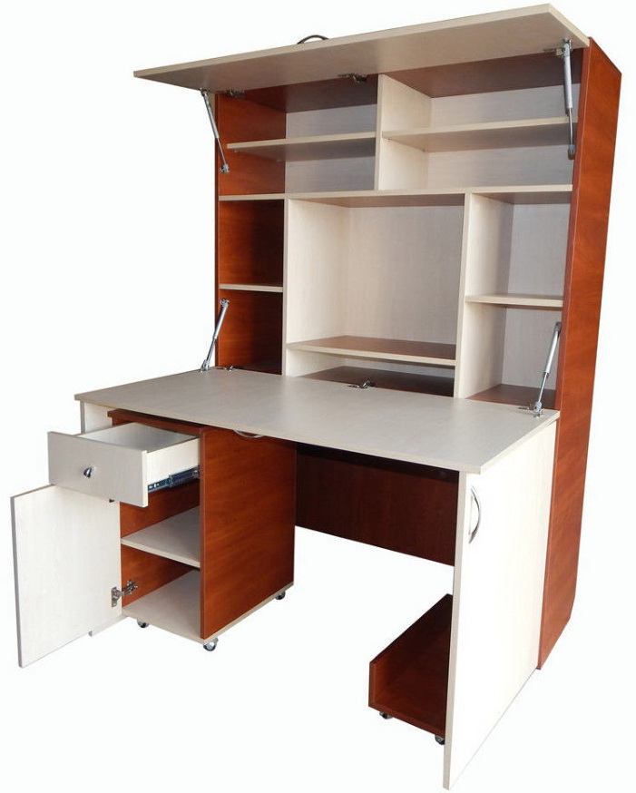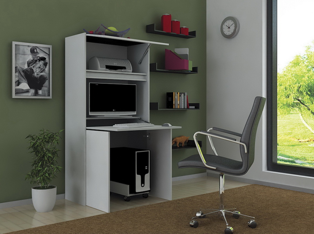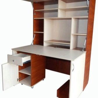 En plus des ordinateurs fixes, combinés à un meuble, il existe des meubles pliants et coulissants. Ils peuvent être un cabinet ordinaire, où la console de travail est cachée. Cependant, avec un mouvement de la main, il est facile de mettre en avant un panneau de travail et de le transformer en un bureau ou un lieu de travail sur ordinateur.