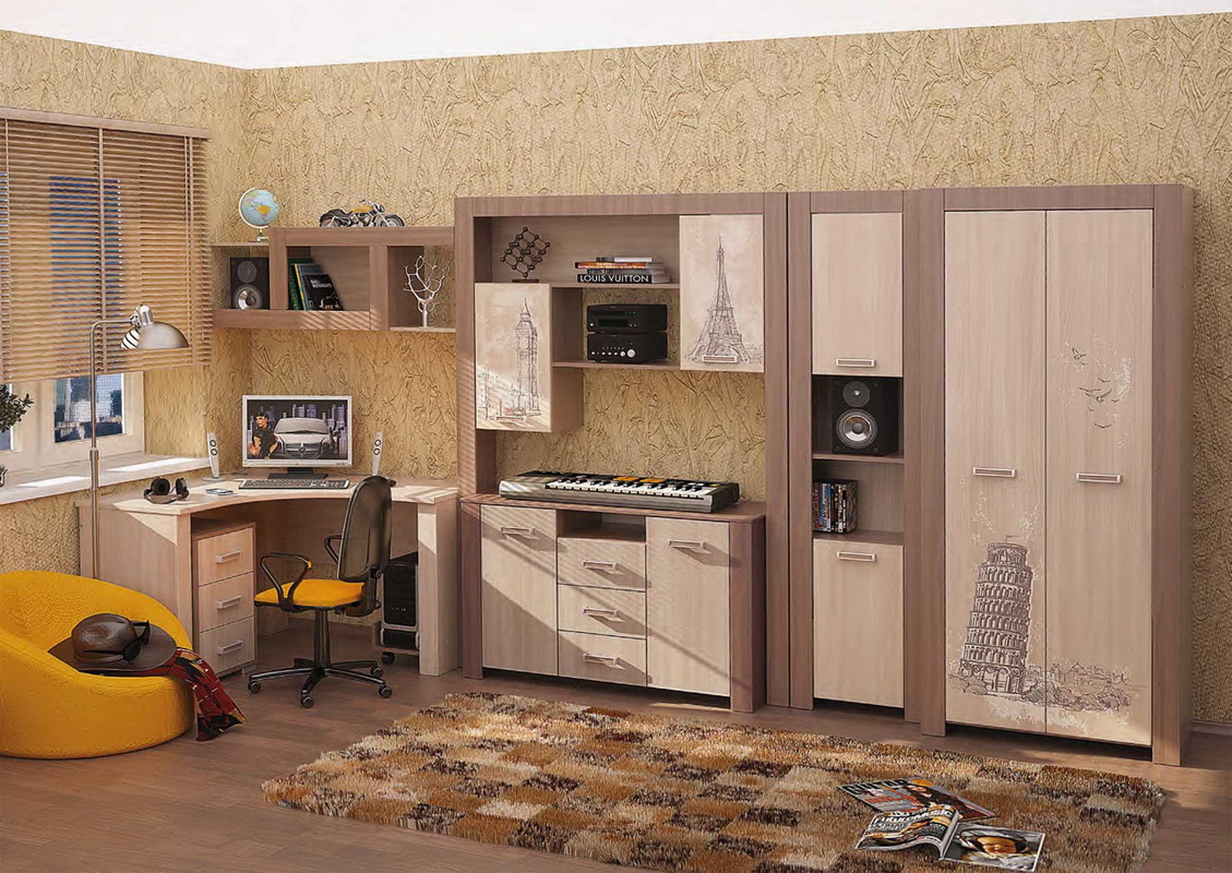 Un coin bureau spacieux est indispensable pour un étudiant ou un écolier. La taille de la surface de travail facilite son installation en tant qu'ordinateur fixe et laisse de la place pour l'écriture de lettres. Ce paramètre est d’une grande importance dans ce cas, car la table n’a pas de tablette coulissante pour le clavier. Mais il est équipé d'un support pour l'unité centrale.Superstructure vous permet de placer confortablement tous les livres et manuels nécessaires. Ils seront toujours à portée de main. De plus, ce meuble comporte un compartiment supplémentaire pour les livres dans la table de chevet adjacente avec tiroirs.