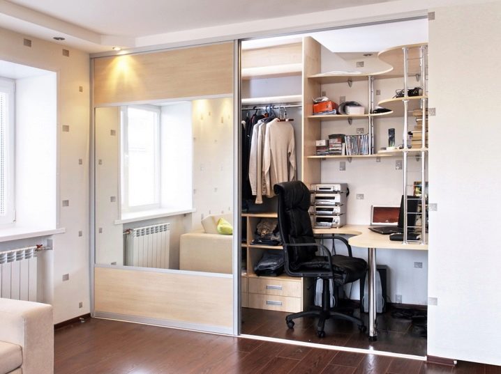 Si vous le souhaitez, vous pouvez masquer le lieu de travail dans le placard. Les portes coulissantes sont faciles à ouvrir pour ouvrir la console. Une chaise peut également y être rangée. Cette technique permet de ne pas encombrer la chambre ou le salon avec des meubles supplémentaires. En outre, cette option plaira à ceux sur le lieu de travail où il y a toujours un désordre artistique. Au-dessus du lieu de travail, vous pouvez organiser des étagères spacieuses.