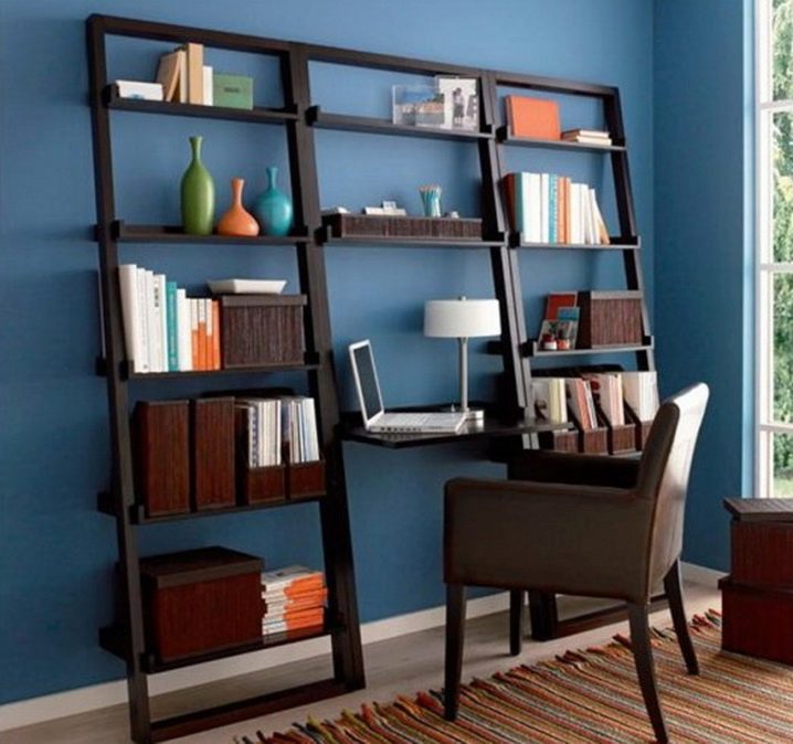 Une table d'ordinateur inhabituelle en forme d'échelle, associée à des étagères, séduira les amateurs de meubles modernes et extraordinaires. Bien que le modèle semble instable extérieurement, ce n'est pas du tout le cas, car ses étagères sont fixées directement au mur. Ils sont très étroits et font de la garde-robe une excellente décoration de toute pièce plutôt qu’un lieu de travail à part entière. Le modèle est en bois sombre présentable, particulièrement élégant avec une chaise en cuir et des vases en céramique de couleurs contrastées.