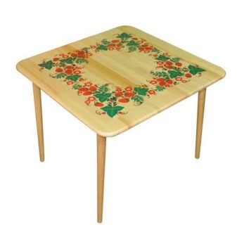 - Un autre chef des ventes est une table basse carrée classique avec des jambes minces. C'est l'option la moins chère des options possibles, vous vous souviendrez sûrement d'une telle table, en bois, vernie, sous laquelle se trouve un motif du style de Khokhloma ou de Gzhel. Ces tables sont souvent dans les jardins d'enfants. Nous savons qu'un enfant est un plaisir coûteux et dans ce cas, il est vraiment possible d'économiser de l'argent. L'essentiel - choisir le bon fauteuil.