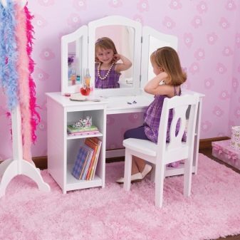 - Parfois, les parents achètent pour les filles un modèle de table avec un miroir intégré, une sorte de petit boudoir. Beaucoup de jeux d'enfants sont basés sur l'imitation des parents et les filles imitent le plus souvent leurs mères: elles s'occupent des poupées, essaient de cuisiner ou de se peindre. Le miroir de table pour enfants aidera votre enfant à apprendre à prendre soin de lui-même. En outre, de nombreux jeunes enfants ont parfois des problèmes d’élocution. En tant que parents, vous devez travailler sur ces exercices et faire des exercices d’orthophonie devant un miroir. Ce tableau sera donc une aide précieuse pour le développement de votre enfant.