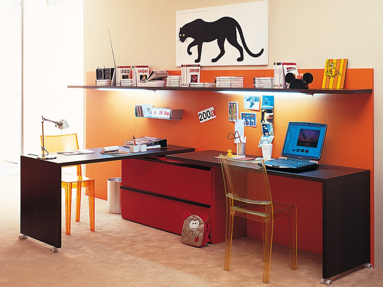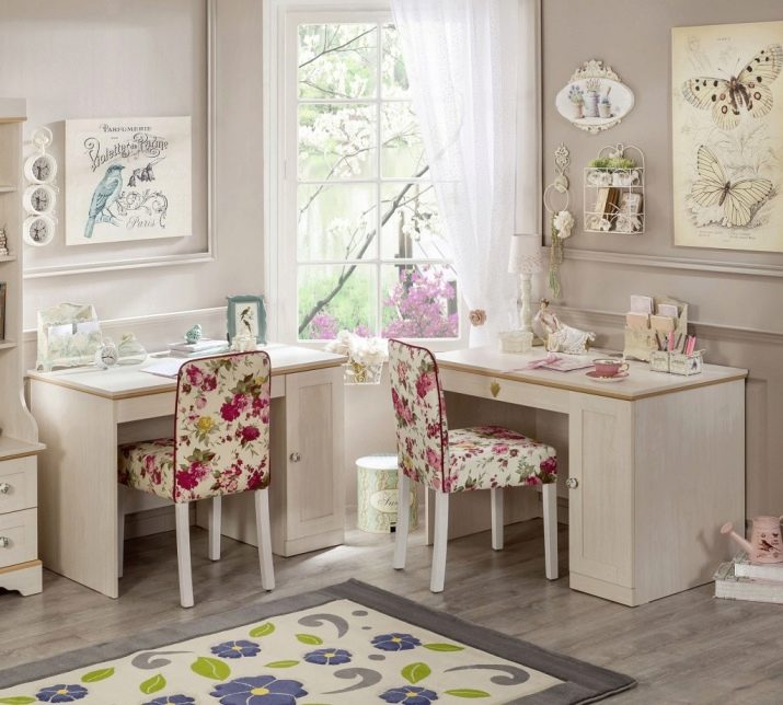 - Si les tables d'angle pour deux filles ne sont pas une option, vous pouvez construire deux tables rectangulaires classiques au même niveau (le long du mur) ou les replacer l'une contre l'autre, formant ainsi un «îlot».
