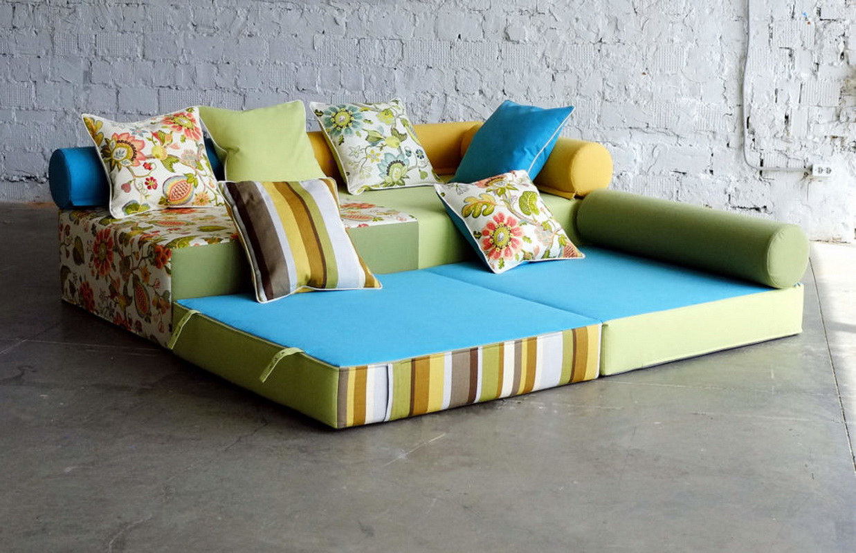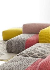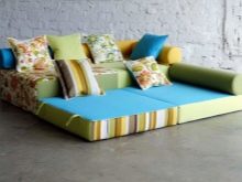 La construction de tels meubles est une opération simple qui nécessite la formation d’un cadre en tissu. Cela vous permet de donner au canapé n'importe quelle forme - d'une simple plateforme horizontale au sac en coin. Il convient de noter que le coût de ce produit est légèrement inférieur à celui des autres produits. Dans le même temps, il est possible de mettre à jour la conception d'un canapé sans cadre presque tous les mois. Pour ce faire, il vous suffit de coudre un nouveau cas, qui est ensuite placé sur chacun des blocs souples.Notez que de cette manière, vous pouvez combiner différentes conceptions d'un seul élément.
