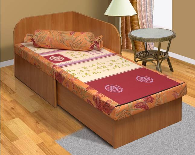 - Pouf enfant coulissant standard. Il peut être à la fois rectangulaire et angulaire. Décomposé sur le système "dauphin". Un endroit pour dormir est tiré d'en bas et est placé à une hauteur égale à celle du siège.
