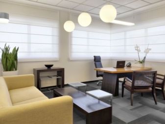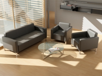 Les tailles de mobilier de bureau sont choisies individuellement, en fonction de la taille de la salle et du nombre de visiteurs. Des canapés d'angle spacieux de 3 mètres conviennent à la salle d'attente. Pour les petites salles de réception, il est préférable de privilégier les modèles compacts à 2 places. Dans les chambres spacieuses, il est possible de combiner de petits modèles triples avec de grands canapés (ou avec des canapés étroits).