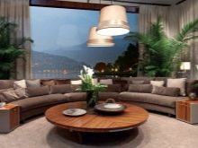 Mais vous pouvez installer un canapé semi-circulaire à partir du coin opposé, puis les contours de la pièce deviendront ovales. Dans ce cas, un coin fermé et vide deviendra un lieu, par exemple pour une lampe sur pied ou un pied surélevé avec des plantes d'intérieur.