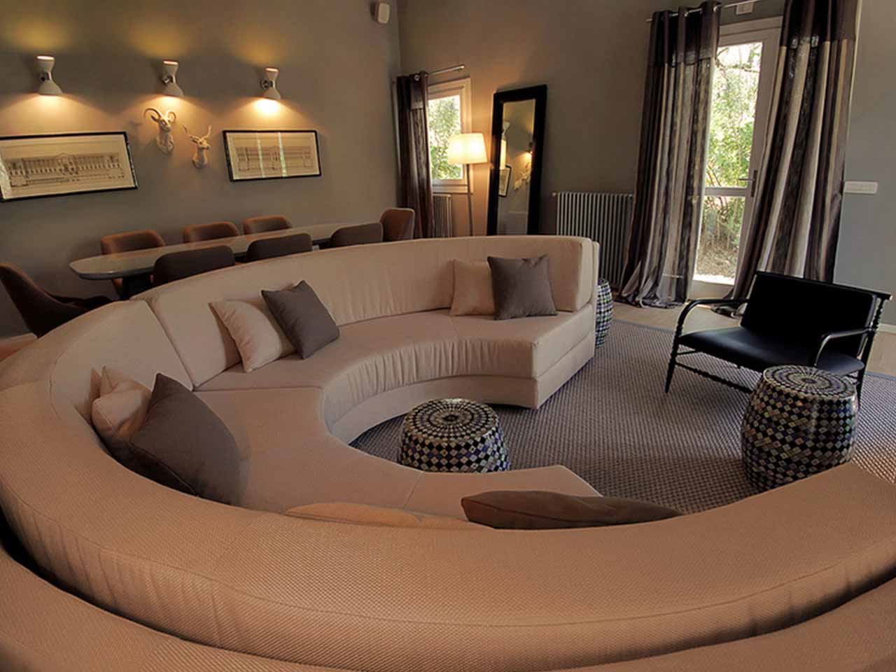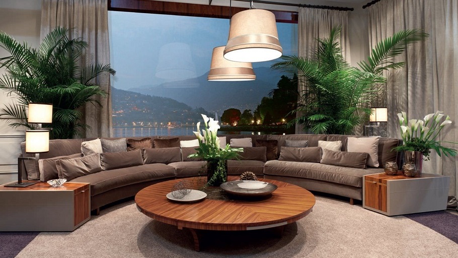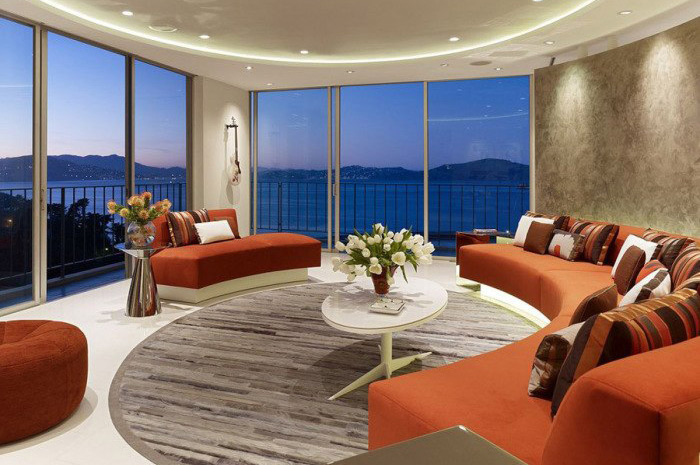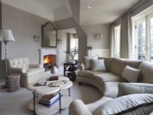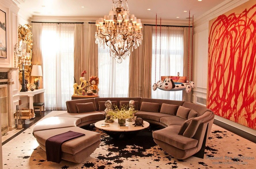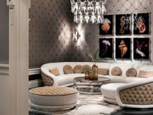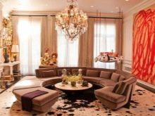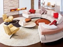 À l'aide d'un canapé semi-circulaire dans le salon, vous pouvez planifier une sorte d'élément de séparation qui séparerait l'aire de repos du reste de la pièce.