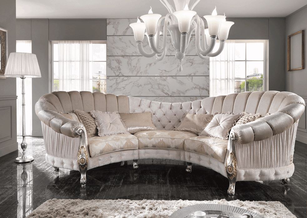 Conception généralement non pliable - le produit est volumineux et lourd. Celles-ci sont généralement installées dans une pièce de grande surface. La forme semi-circulaire d'un canapé monocouche est réalisée le plus souvent dans les styles victorien, empire, classique, moderne ou provençal.