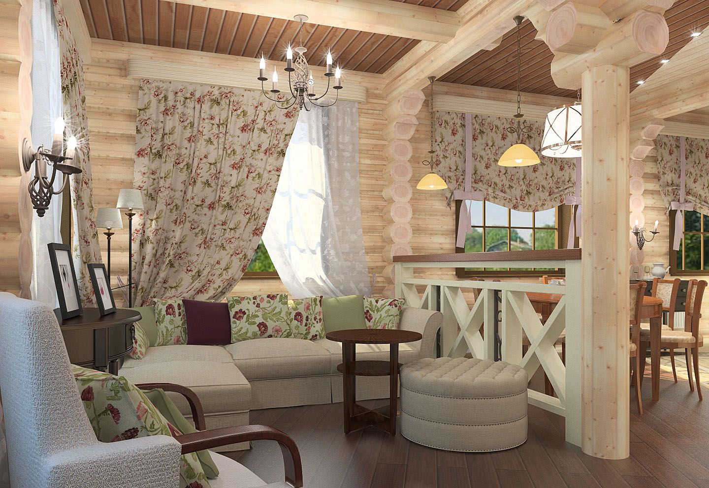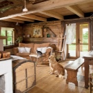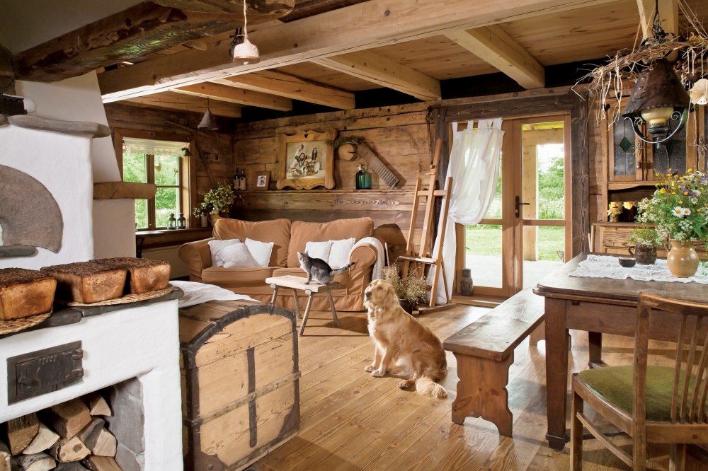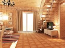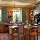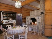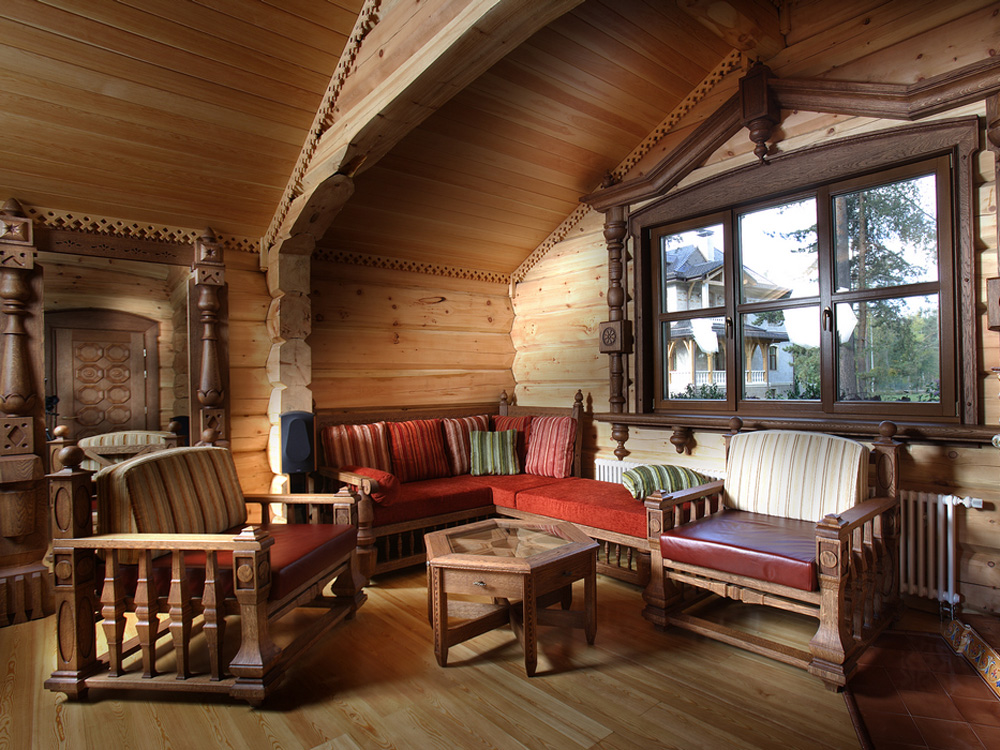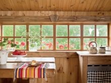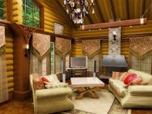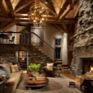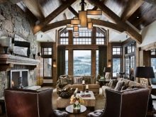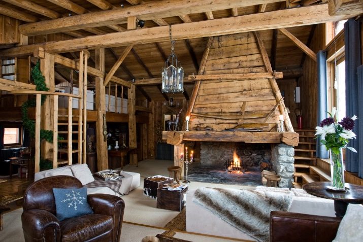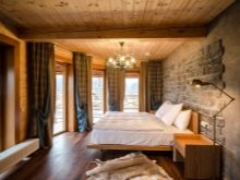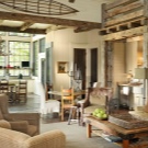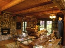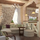 Ce sont des pièces spacieuses et lumineuses, des poutres massives et une abondance de bois. La décoration intérieure des murs n’est pratiquement pas nécessaire, vous ne devez traiter que le bois, en lui donnant la nuance désirée, associée à la couleur du mobilier choisi. Pour les inserts décoratifs, vous pouvez choisir la pierre naturelle ou artificielle. Les éléments de mobilier et de décoration sont assez simples, pas surchargés de détails.