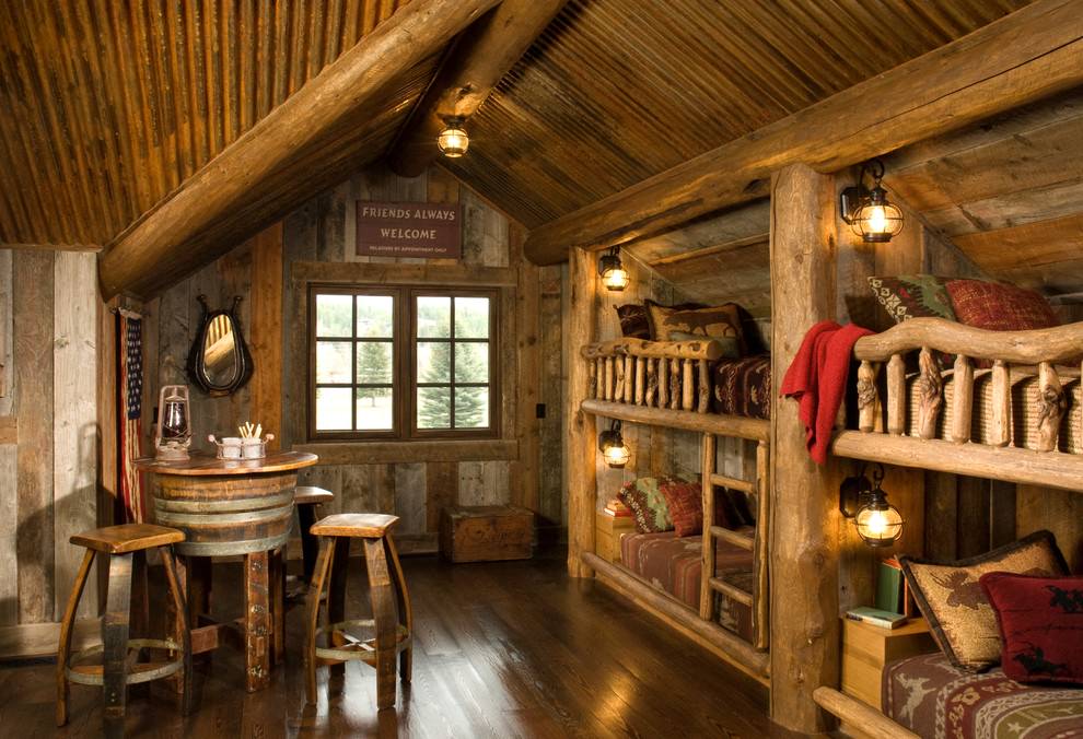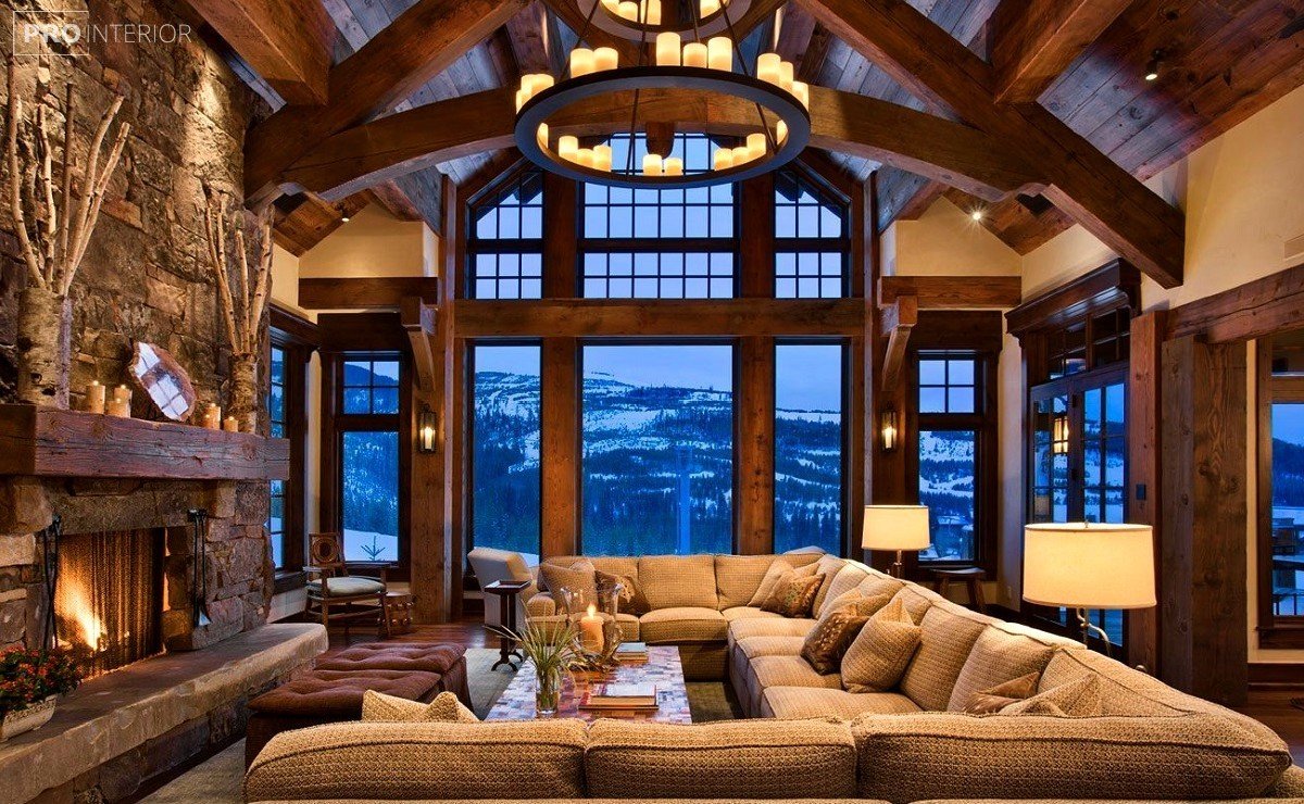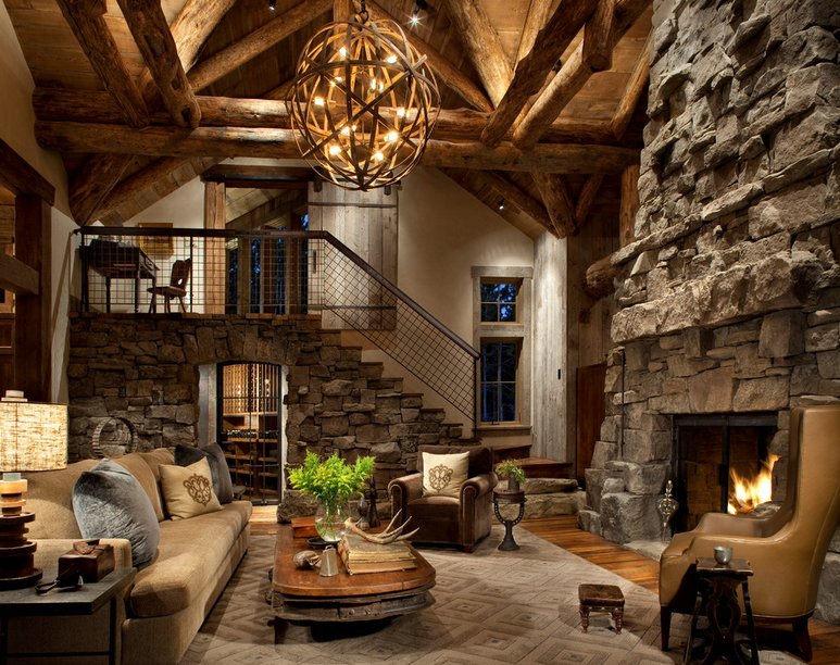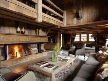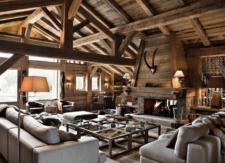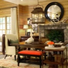 Dans le salon, le point d’attraction est un grand canapé en cuir et des fauteuils qui, si nécessaire, se transforment en lieux de couchage. À côté des accessoires obligatoires, souvent forgés artificiellement, se trouvent des accessoires forgés pour la cheminée. Le sol a l'effet d'usure, il est recouvert de tapis et de peaux d'animaux.