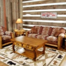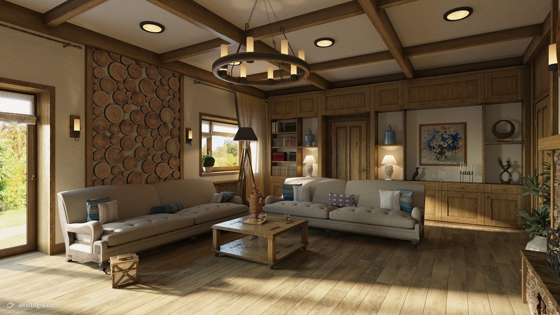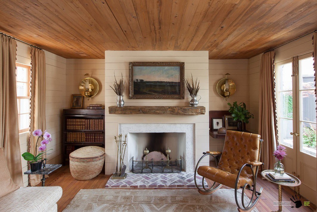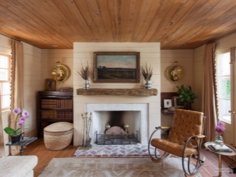 En règle générale, dans le salon, le sol est choisi pour le sol ou le stratifié imitant le parquet. Parfois, il devient peint. Un tapis tissé est utilisé comme décor. La décoration murale est également réalisée "sous le sapin", à l'image d'un bar ou d'un blockhaus. Enduit décoratif possible, papier peint liquide ou ordinaire. Le plafond est fait très simplement - il est recouvert de peinture blanche et complété par de fausses poutres.