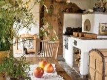 La conception de la cuisine d'une maison rurale devrait se chevaucher avec celle du salon. Une partie au moins du mobilier doit être en bois ou avec des façades, faite "sous l'arbre". Les plafonds sont recouverts de peinture à base d'eau. Pour la décoration, des objets en terre cuite, des textiles, des matériaux naturels sont choisis. Des rideaux de dentelle et un tapis au sol complètent parfaitement l'intérieur.