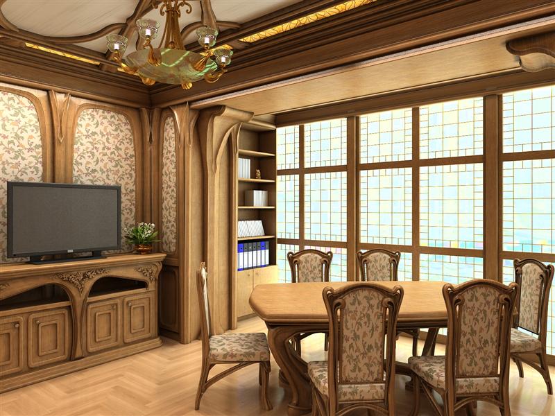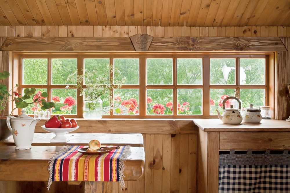 Le décor de la maison en bois est créé en fonction de vos besoins et des caractéristiques de la conception elle-même. Le petit espace peut être augmenté visuellement en sélectionnant de grandes fenêtres.Ajuster la hauteur du plafond permettra de fausses poutres et des ouvertures cintrées de différentes formes. Des plateaux sculptés, des appuis de fenêtre et d'autres éléments «antiques» ajouteront à la pièce moderne une pièce du passé.