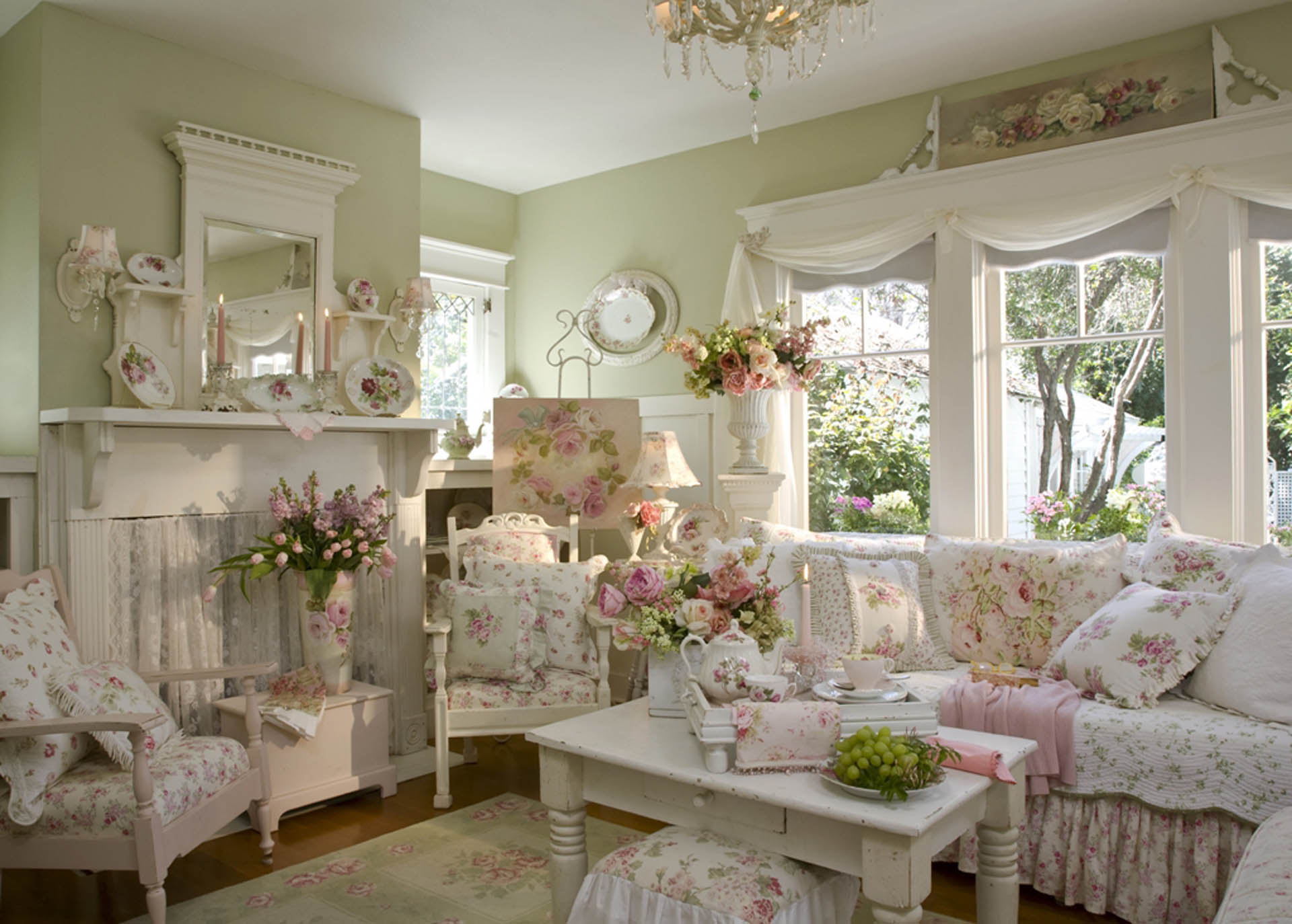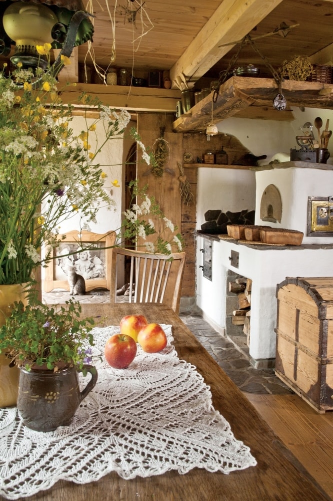 Comme décor, il y a une abondance de fleurs: vivant, sur les façades, dans les peintures, sur les textiles et la vaisselle. S'efforcer d'ajouter une touche d'antiquité - Pensez aux lampes au kérosène, aux chandeliers ou aux lanternes forgés.