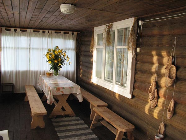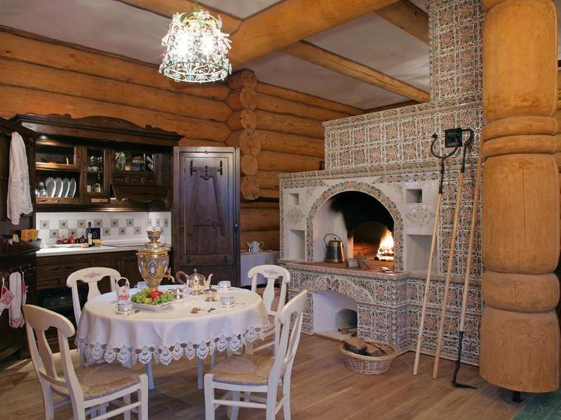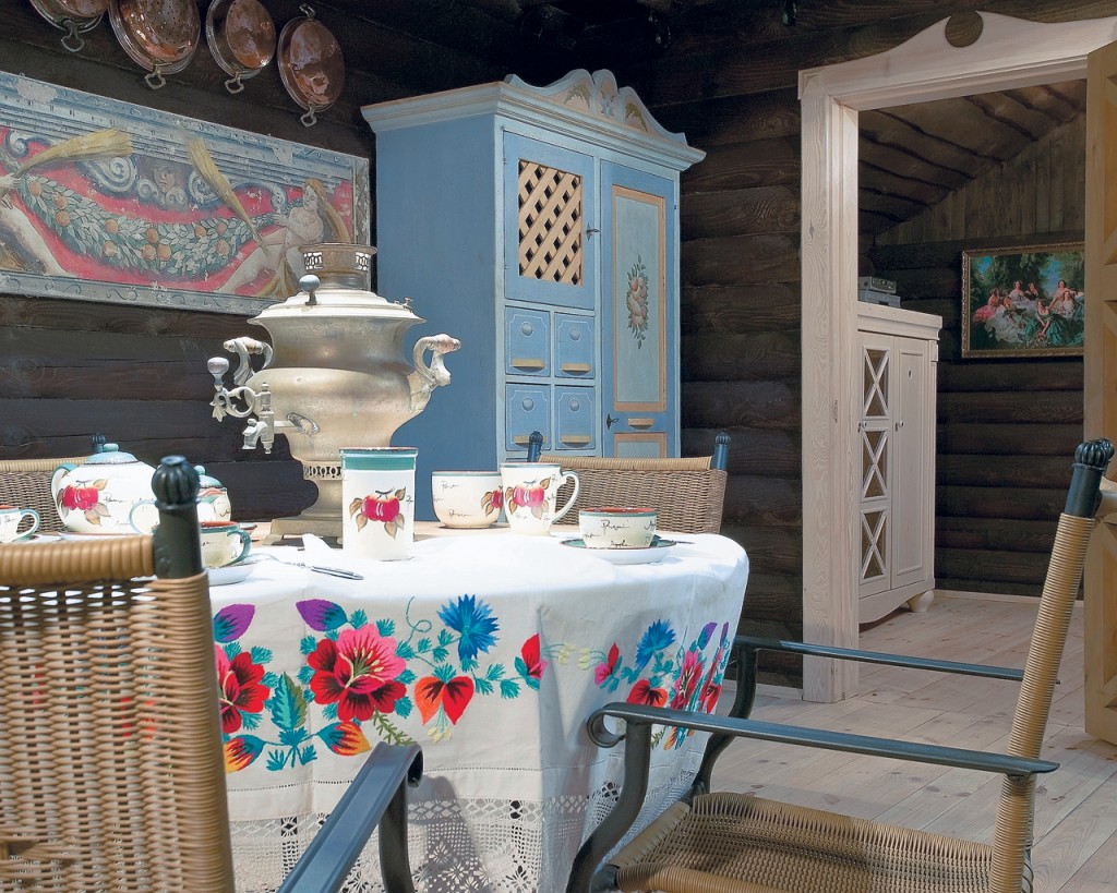 Pour décorer une maison dans un style russe rustique, vous devez poncer les murs et y appliquer de la laque. N'oubliez pas le mobilier obligatoire: grand coffre et poêle, véritable ou stylisé, avec pile de bois, poignée, panier pour le bois de chauffage et autres détails d'époque. En pensant au décor, référez-vous aux éléments traditionnels: chrysalides en paille, plateaux sculptés, coq au lieu d’une girouette, souliers bâtons au mur, poupées, grand samovar sur la table de la cuisine et longs bancs sur les côtés.