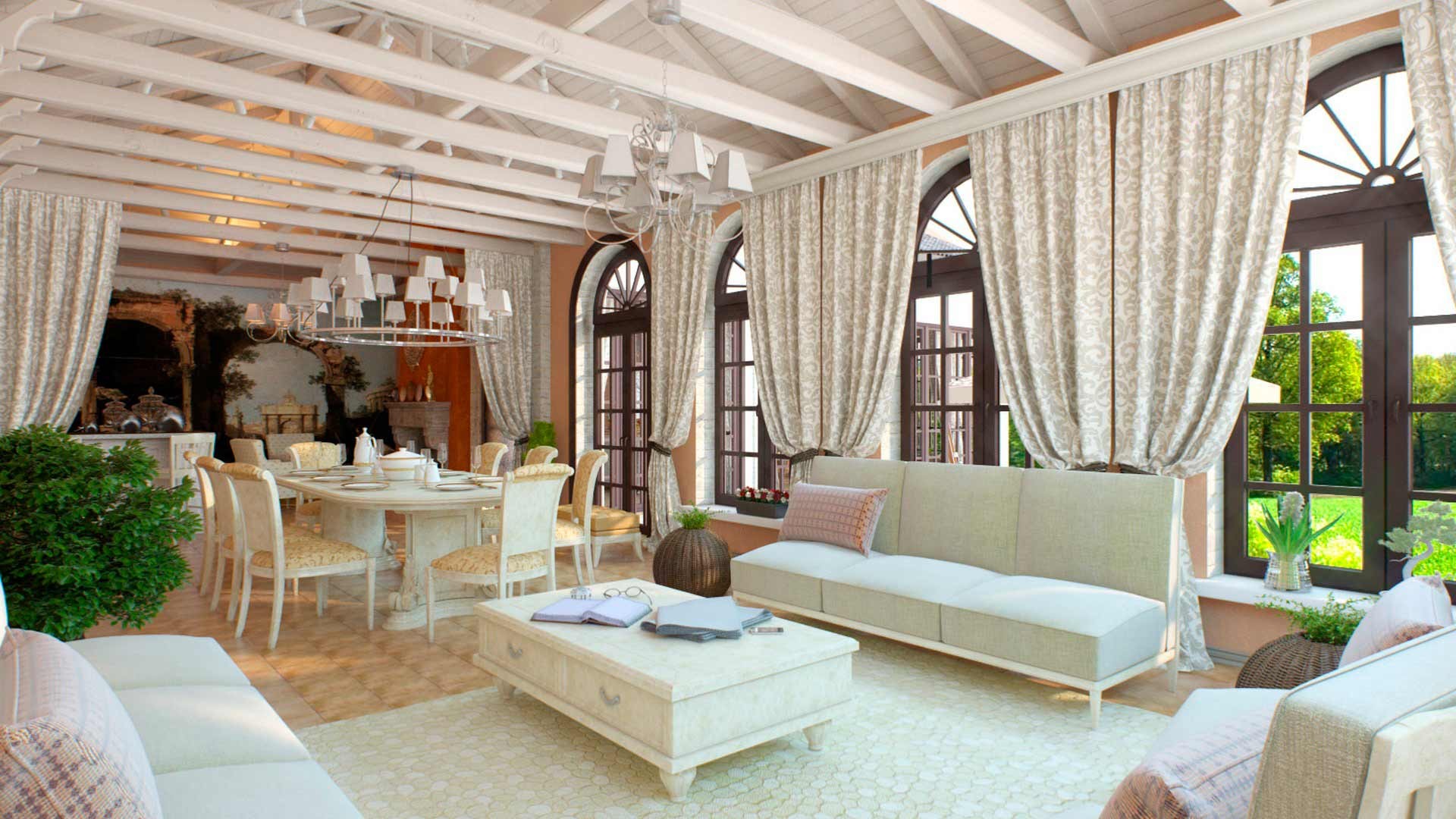 Le style implique des couleurs chaudes et simples, de la brique et de la pierre décorative. Les textiles sont décorés d'une grande cage et d'images en patchwork. Nécessaire cheminée et mobilier dans les tons pastel. Une véranda chauffée vous permettra d’équiper une autre pièce - en salle à manger, bibliothèque ou bureau. Complétez l'espace avec des fauteuils à bascule, des tables basses et des tapis à poil long.
