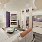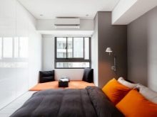 Le minimalisme dans la conception est bon car il utilise des éléments transformants, tels qu'un lit, un canapé ou une table. Pour la cuisine, la meilleure option serait un ensemble complet avec des armoires,toute la longueur du mur: du sol au plafond.