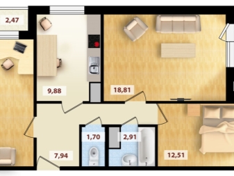 L'avantage de tels appartements est que dans l'une des pièces à vivre, il y a une soi-disant salle de stockage. C'est bien parce qu'il y a généralement une place sous le vêtement d'extérieur. Jolie pas un mauvais moyen d'économiser de l'argent et de refuser d'acheter de grandes armoires, ce qui réduit considérablement les mètres carrés et réduit la taille de la pièce.