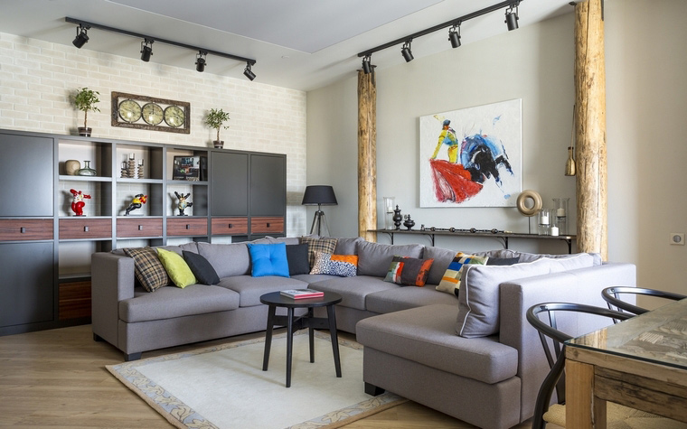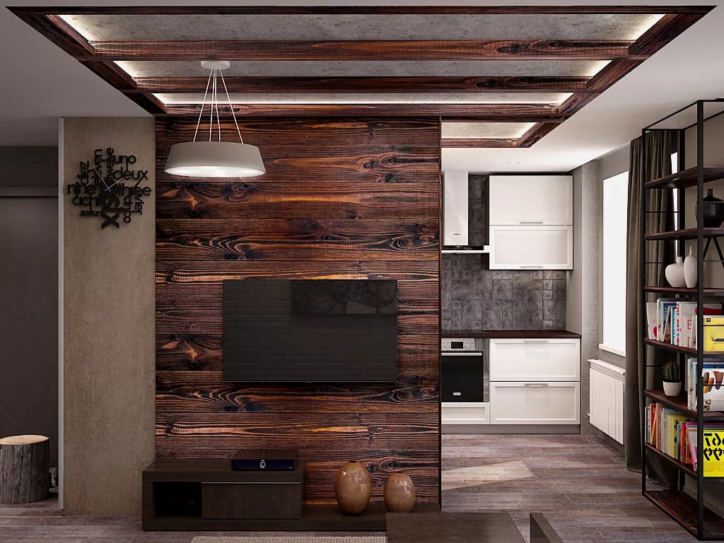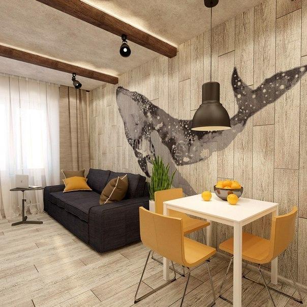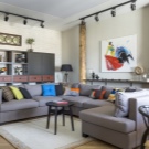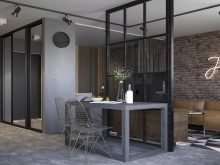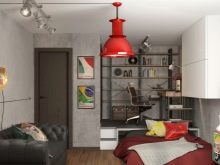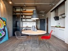 Le zonage est une partie importante d'une telle pièce. La cuisine peut être séparée de la pièce par un grand canapé, une table à manger ou un comptoir de bar. Le bureau peut être séparé de l’espace général par une commode ou une caisse. Pour le zonage, utilisez des écrans, des étagères, des cloisons ou des blocs de verre.