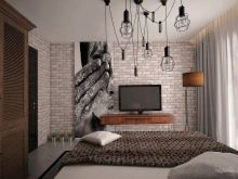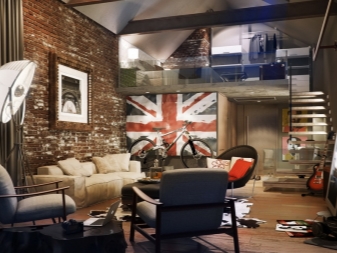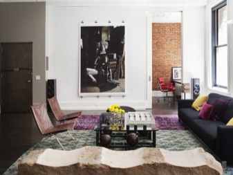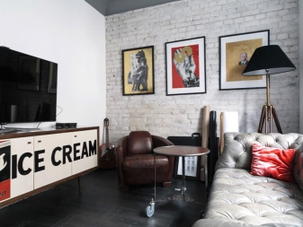 L'approche pour le choix des accessoires doit être non standard. Affiches, graffitis, peintures dans des cadres anciens seront spectaculaires et originales.sculptures, photographies en noir et blanc, panneaux de signalisation, instruments de musique, panneaux de signalisation routière, lanternes. Leur emplacement peut être le plus inattendu.