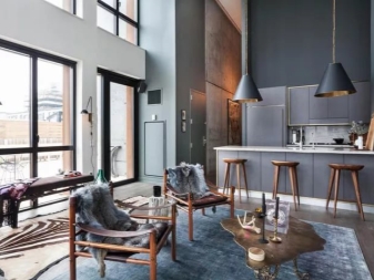 A notre époque, ce style est très populaire. Pour le créer, vous avez besoin de pièces avec de hauts plafonds, un grand espace libre. La salle est ouverte, presque pas de partitions. Cette exigence ne s'applique pas aux salles de bain et aux pièces de service. Ils sont clôturés de l'espace principal, mais dans le même style.