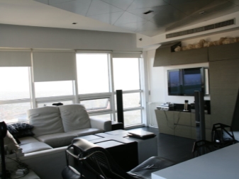 La partie la plus importante et la plus extraordinaire de l'intérieur dans le style du brutalisme est le plafond. Il est décoré de poutres en bois ou de boîtes en placoplâtre. Pour que le décor soit visible, la pièce a besoin d'un bon éclairage. en raison de la lumière artificielle et du jour. Par conséquent, les fenêtres ne rideau. Si vous n'aimez pas les fenêtres sans rideaux, vous pouvez choisir un rideau texturé épais, mais pas les rideaux classiques des appartements urbains.