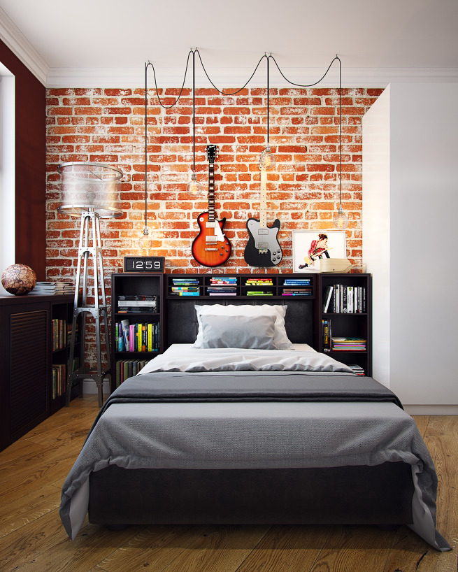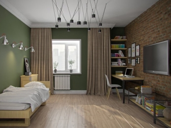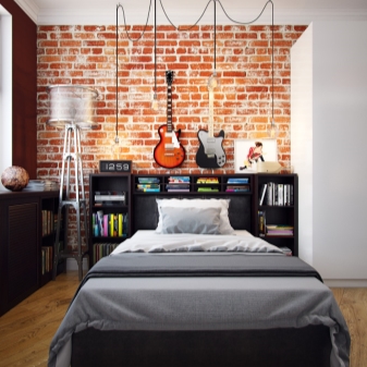 Si la pièce est destinée pour un jeune homme, il est préférable de prendre des teintes claires. Des éléments décoratifs lumineux sur les murs et l'éclairage aideront à le remplir de l'ambiance nécessaire. Des affiches, des photographies, des peintures peuvent être utilisées comme décorations murales.