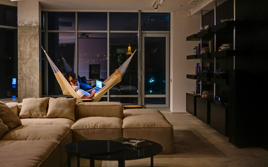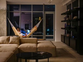 Si la taille de la pièce le permet, vous pouvez suspendre un hamac dans la zone de loisirs. Pour adoucir les rudes intérieurs d'un logement de célibataire, vous pouvez poser un tapis dans la chambre ou la chambre d'amis.