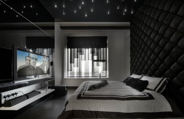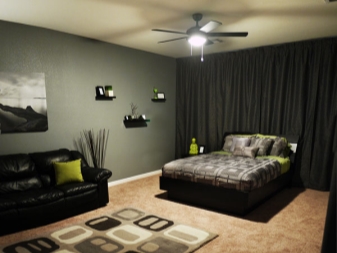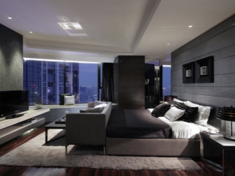 Il ne devrait y avoir rien de plus dans la chambre d'un célibataire. Armoires massives et mobilier standard pour la chambre des hommes seraient inappropriés. Les armoires doivent être remplacées par des étagères, des niches cachées ou des étagères ouvertes.pour maximiser l'espace de la pièce et le rempliravec la lumière. Les canapés habituels doivent préférer les sacs de fèves, les canapés modulaires, les grands oreillers et les tabourets rembourrés (pour les invités).