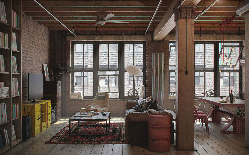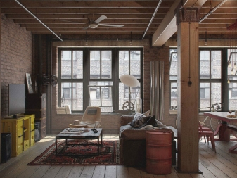 Les meubles de style loft doivent paraître simples, mais pas ascétiques, de sorte que même l’installation d’antiquités inhabituelles est autorisée.Les murs de la pièce peuvent être décorés avec des affiches, des peintures, des graffitis, des panneaux de signalisation. Tout cela s'intègre bien à l'intérieur.