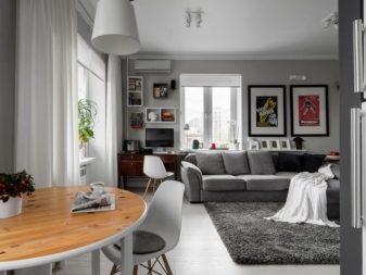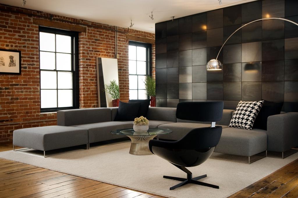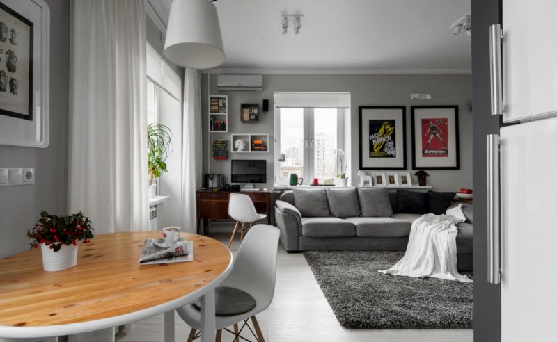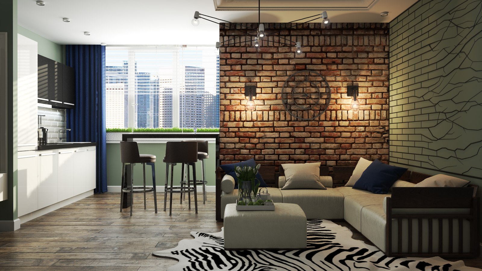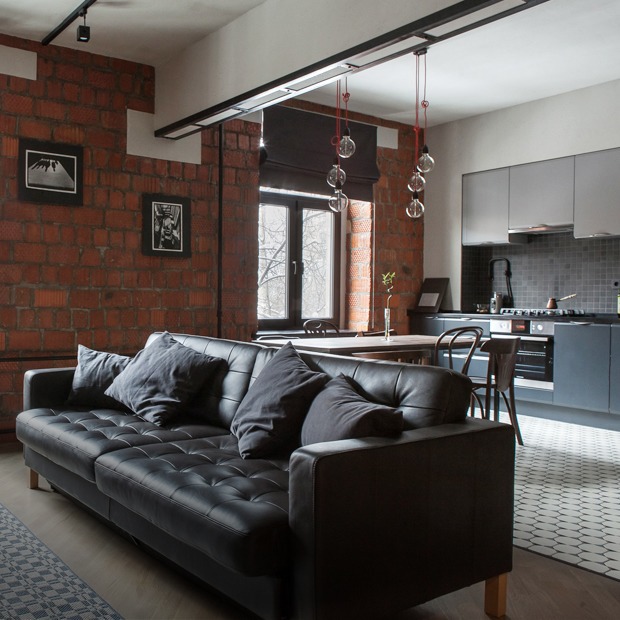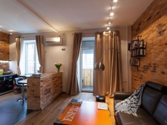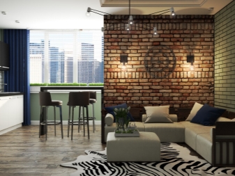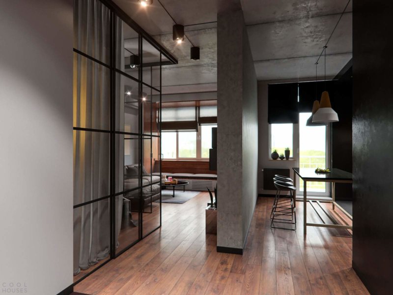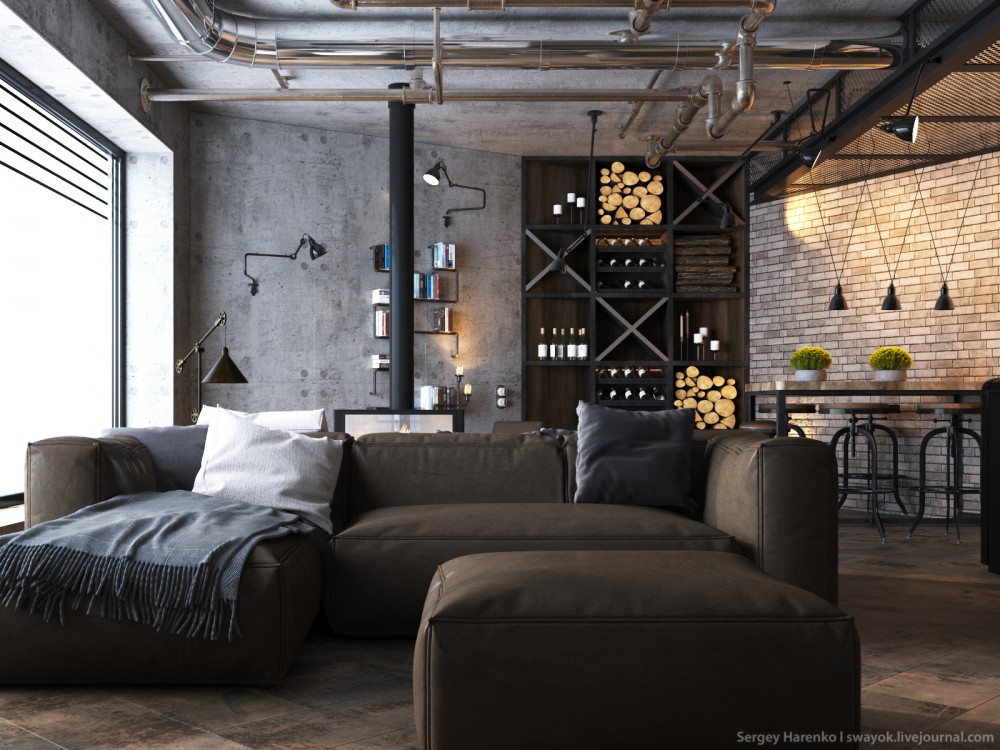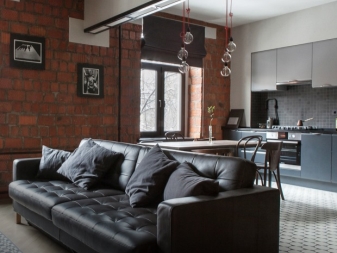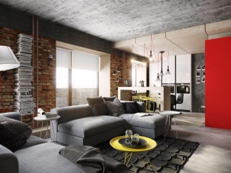 L'ensemble de l'appartement, décoré dans le style d'un loft, doit former un seul et même espace. Le zonage ne peut concerner que la chambre et la salle de bain. La distinction est obtenue non par la construction de cloisons intérieures, mais par les contrastes de couleurs, l’éclairage et le placement des meubles.