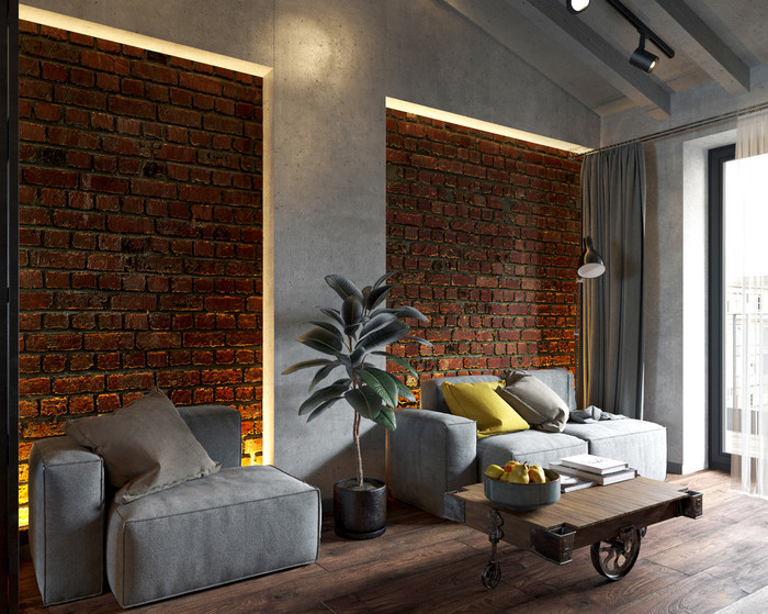 Les murs et les sols peuvent imiter les dalles de béton nues. En outre, les murs peuvent être décorés avec des panneaux de bois de tons gris ou de maçonnerie claire.