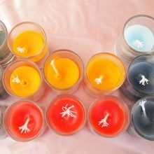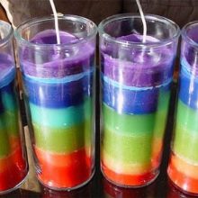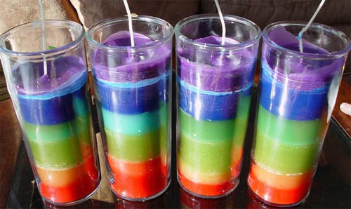 - À partir d'un verre inutile, vous pouvez créer une bougie inhabituelle. Pour ce faire, vous aurez besoin des crayons de cire habituels et d’un fil de coton épais. Vous devez immédiatement le baisser dans un verre. Sélectionnez plusieurs couleurs de crayons, prenez-en un et faites fondre à l'aide d'un briquet dans un verre de fil. Faites de même avec de la cire à colorier de couleur différente pour obtenir une belle bougie multicolore.