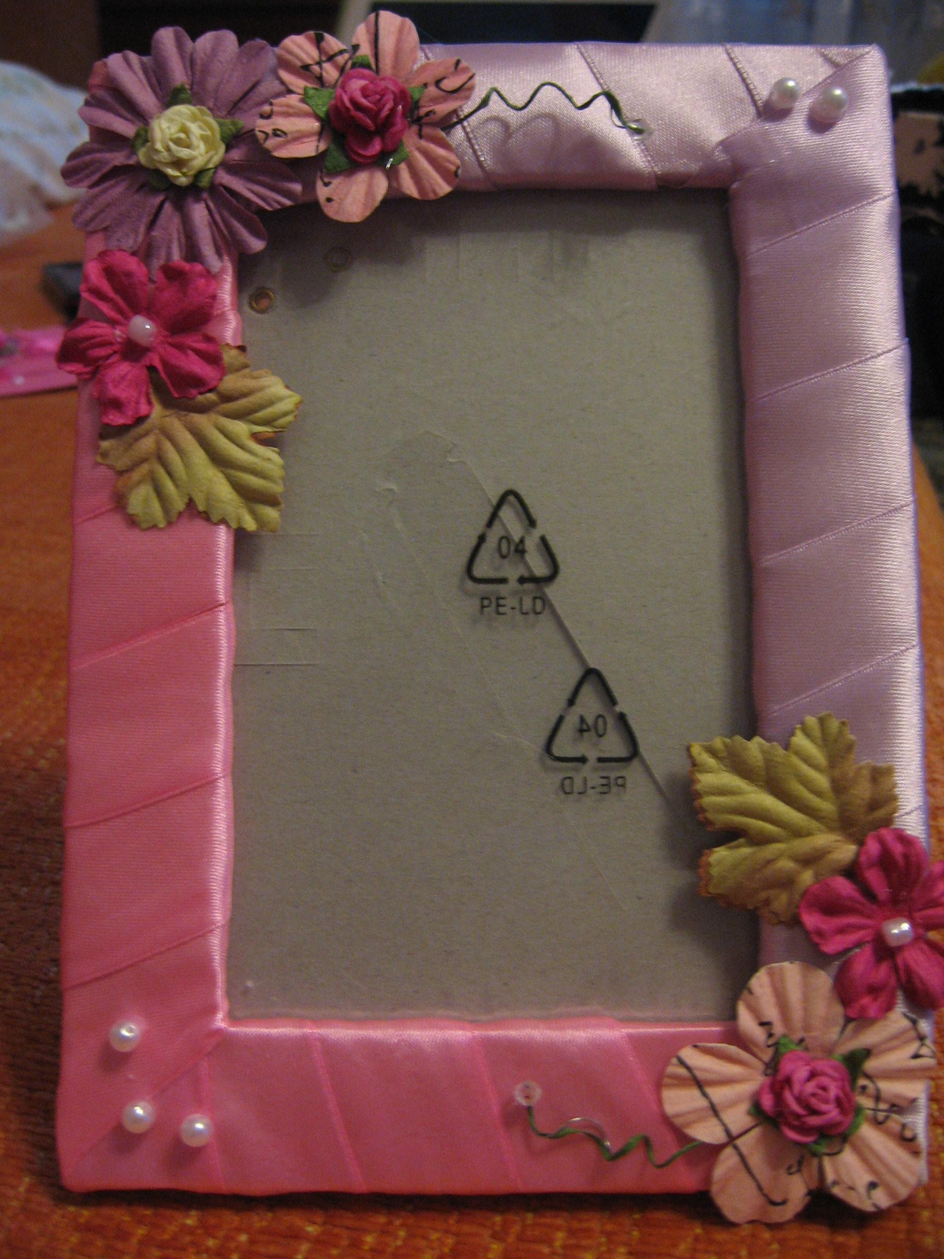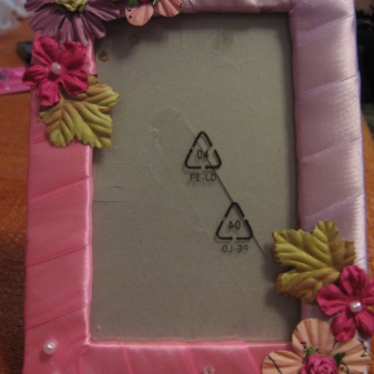 - Le plus simple est d’envelopper le cadre avec un beau ruban de satin. L’extrémité d’un tel ruban devrait être collée à l’arrière du cadre, puis envelopper fermement le cadre de vol en diagonale. Faites particulièrement attention aux coins - à la place des coins, vous devez rentrer doucement le ruban adhésif et le fixer avec de la colle du mauvais côté.