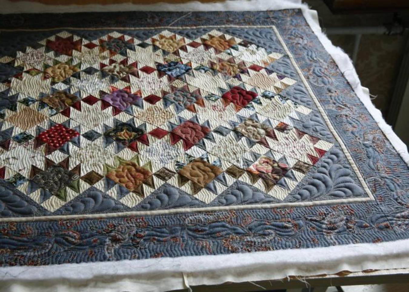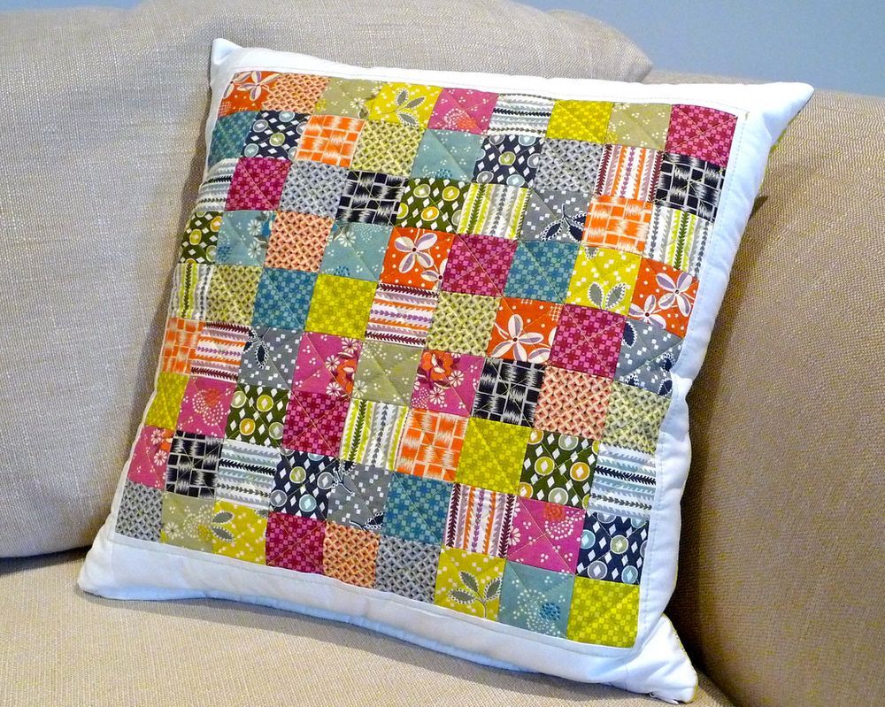 - À partir des carrés, assemblez un côté de l’oreiller, fixez-les avec des points légers ou des épingles, puis cousez délicatement sur la machine à coudre pour obtenir une toile solide.