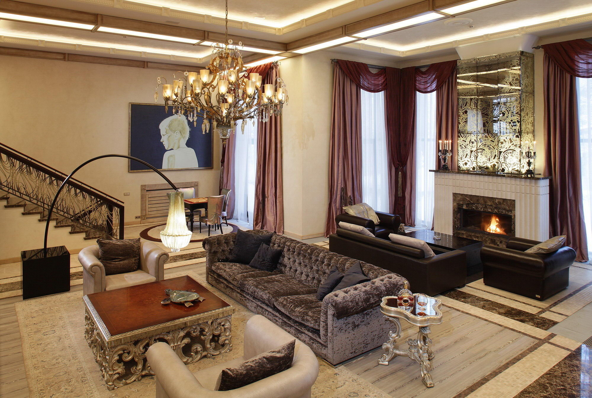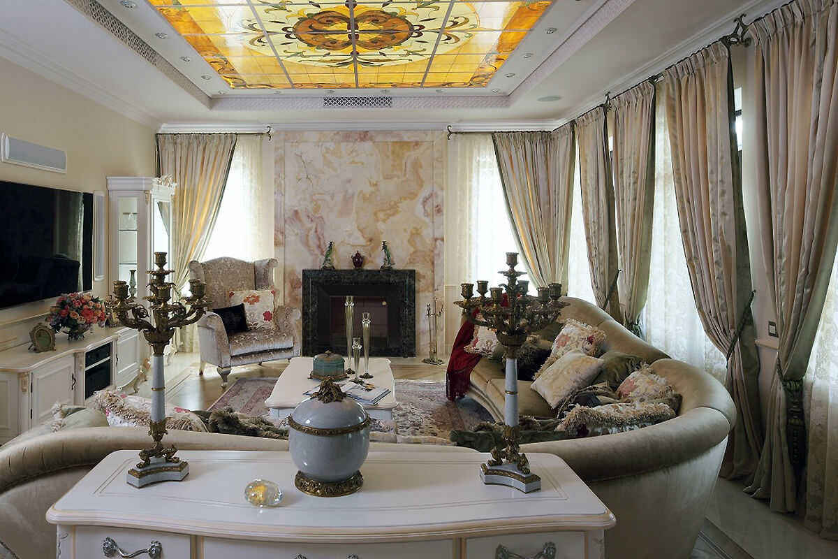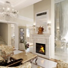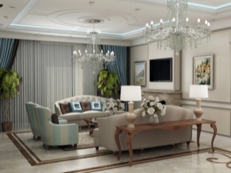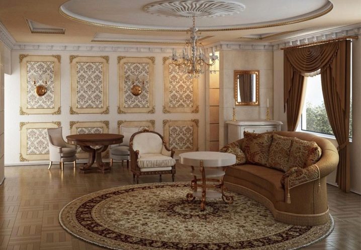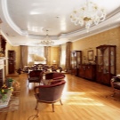 Le dernier exemple en date est un salon luxueux décoré dans un style classique. Chaque élément est vérifié et associé à toutes les règles. Une base en parquet clair, un plafond décoré de manière inhabituelle avec du stuc sur les bords et au centre créent la toile de fond idéale pour de beaux meubles, qui semblent appartenir à des époques révolues.