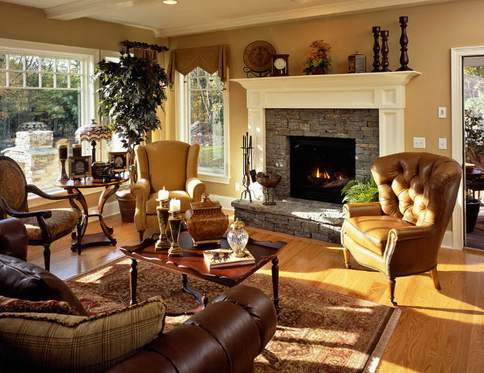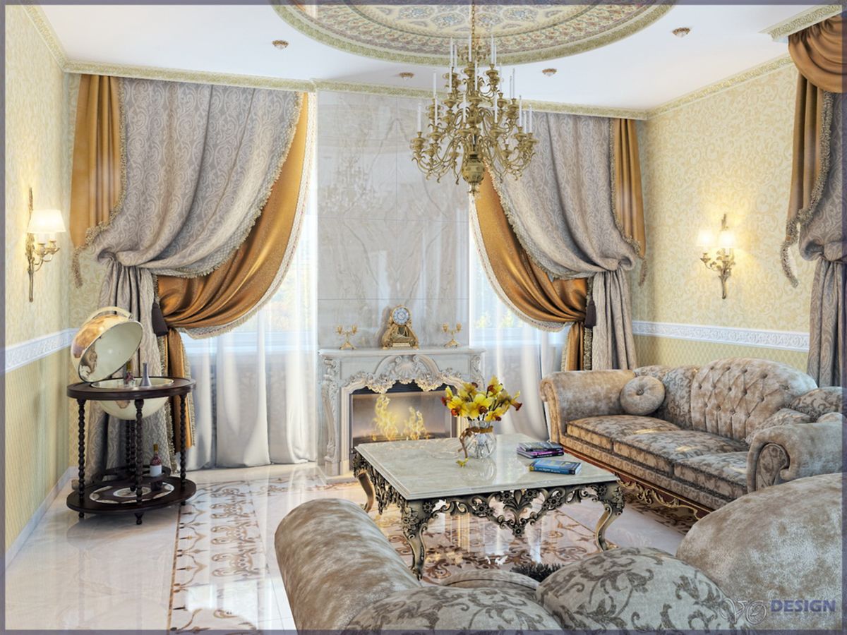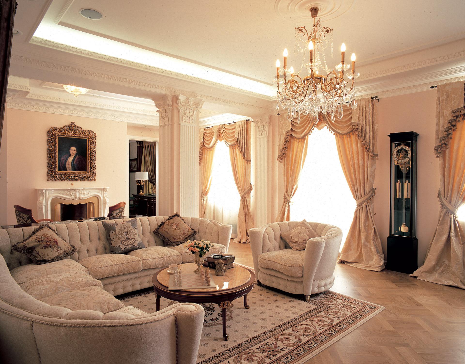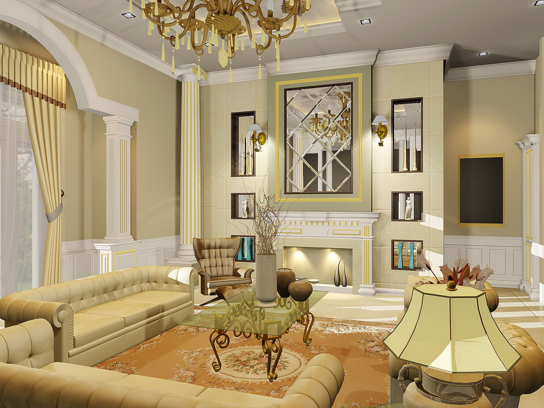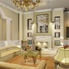 La palette de couleurs du salon dans le style d'un classique devrait être aussi calme et retenu que possible. Couleurs pastel appropriées, toutes les nuances de marron et monochromes.