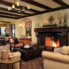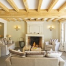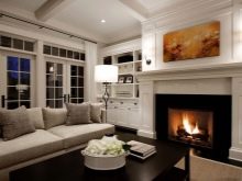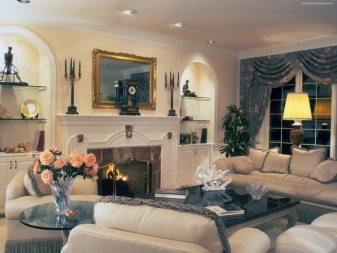 La pièce choisie est assez petite. Pour le rendre plus spacieux, des couleurs claires sont utilisées dans la conception des murs, du sol et du plafond, ainsi que dans la sélection des rideaux, des meubles et des tapis.Tous ces détails sont très soignés, lumineux et n'attirent pas l'attention. En contraste avec un tel socle, le mur et la cheminée en bois ornés de panneaux de bois sont magnifiques et attirent immédiatement l’attention.